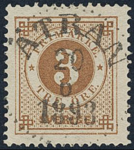 Sweden. Facit 41a used, 3 öre yellowish brown. EXCELLENT cancellation ÄTRAN 20.6.1893.