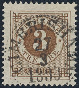 Sweden. Facit 41c used, 3 öre dark orange-brown. Superb cancellation CIMBRISHAMN 27.3.1890.