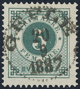Sweden. Facit 43b used, 5 öre dark green, clean distinct print. EXCELLENT cancellation GEFLE 20.9.1887. Signed by O.P.