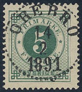 Sweden. Facit 43e used, 5 öre emerald green. EXCELLENT cancellation ÖREBRO 14.2.1891.