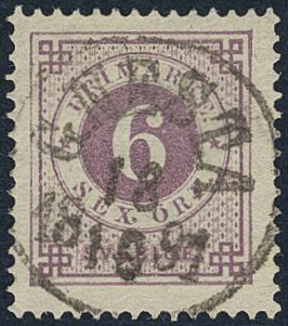 Sweden. Facit 44b used, 6 öre red-lilac. EXCELLENT cancellation GNESTA 18.10.1891.