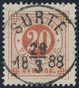 Sweden. Facit 46b used, 20 öre light orange-red. EXCELLENT cancellation SURTE 29.3.1888. Signed by O.P.