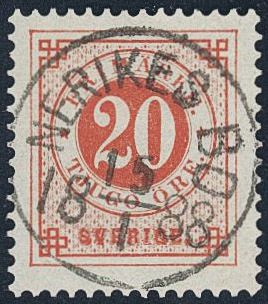 Sweden. Facit 46c used, 20 öre dark orange-red. EXCELLENT cancellation NERIKES BO 15.1.1888.