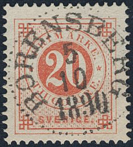 Sweden. Facit 46d used, 20 öre dark orange-red on yellowish paper. Superb cancellation BORENSBERG 5.10.1890.