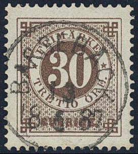 Sweden. Facit 47a used, 30 öre olivish brown. EXCELLENT cancellation BARSEBÄCK 13.5.1887.