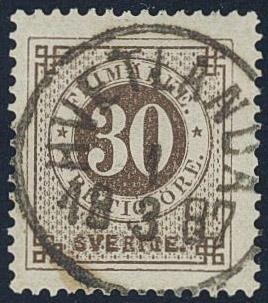 Sweden. Facit 47c used, 30 öre black-brown. EXCELLENT cancellation HVETLANDA 1.3.1887.
