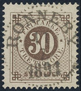 Sweden. Facit 47f used, 30 öre orange-brown. EXCELLENT cancellation RONNEBY 11.1.1891.