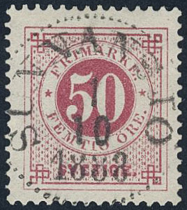 Sweden. Facit 48c used, 50 öre violet-carmine. EXCELLENT cancellation SUNNANSJÖ 1.10.1888.