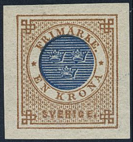 Sweden. Facit 49v1 ★, 1 Krona brown/blue, imperf variety. Superb. SEK 3500
