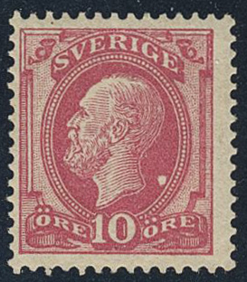 Sweden. Facit 39 ★★, 1885 Oscar II, letterpress 10 öre red. With interresting large white spot to the right of the neck (temporary). SEK 6500