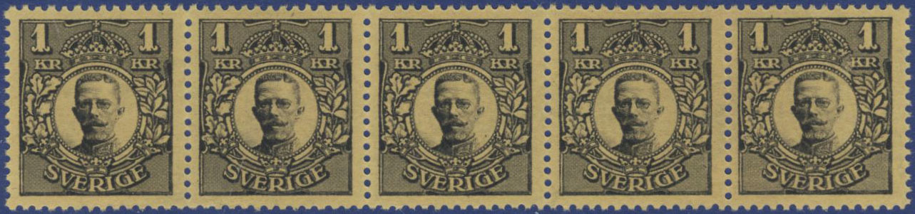 Sweden. Facit 96 ★★, 1 Kr black without watermark in a very fresh strip-of five. SEK 9000