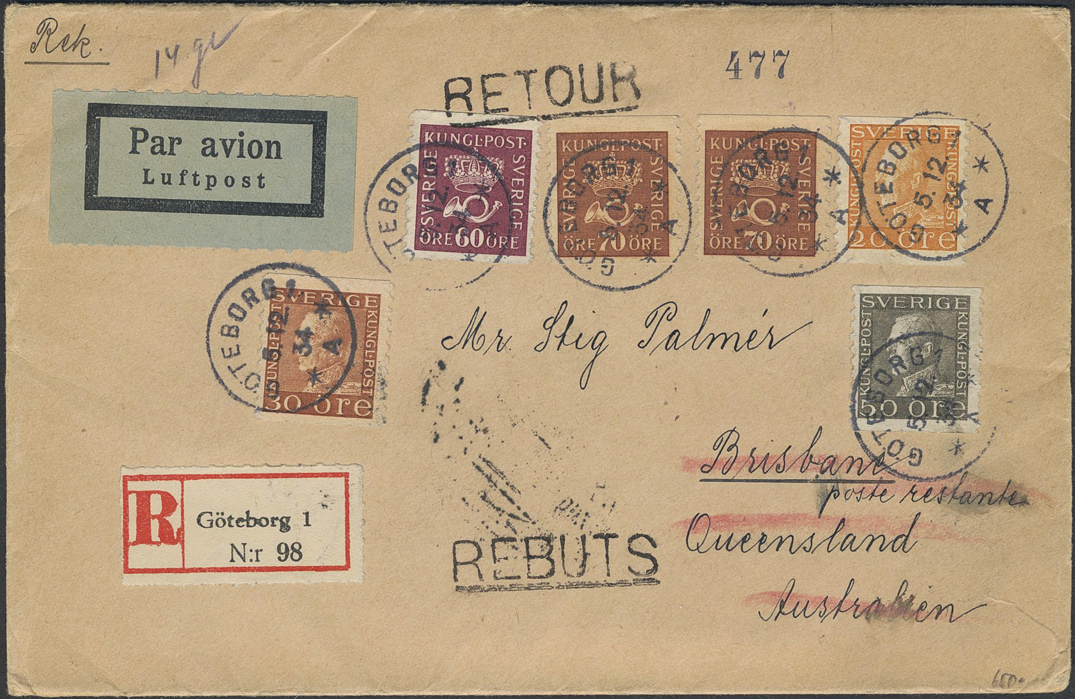 Sweden. Facit 164, 163, 181, 186, 192 on cover, 20+30+50+60+2×70 öre on registered air mail cover sent from GÖTEBORG 1 5.12.34 to Australia. Undeliverable with cancellations REBUTS and RETOUR.