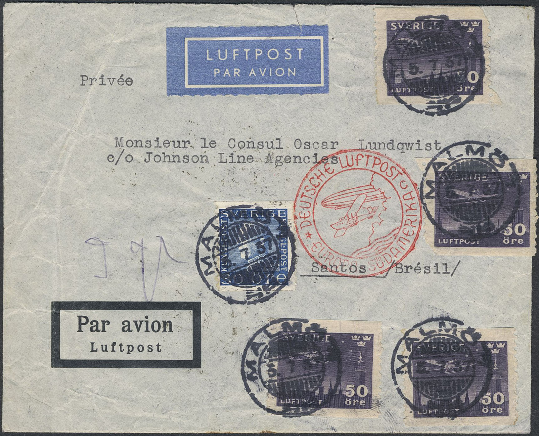 Sweden. Facit 185, 232 on cover, 30+4×50 öre on air mail cover sent from MALMÖ 5.7.37 to Brazil. Small imperfections, still beautiful.