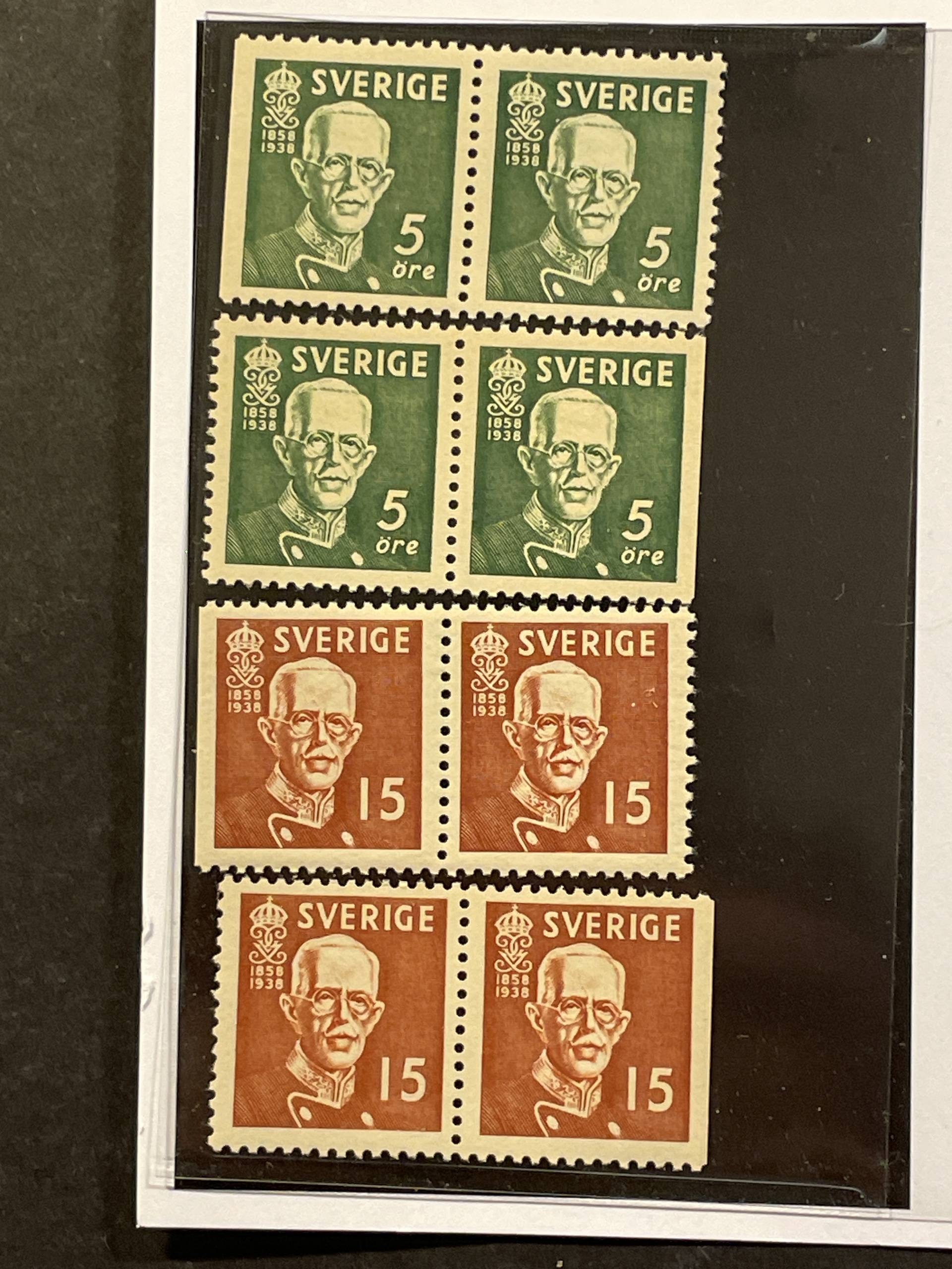 Sweden. Facit 266–67BC/CB ★★, 1938 80th Birthday of King Gustaf V 5 + 15 öre pair 3+4 and 4+3 (4). Wide margins. SEK 2300