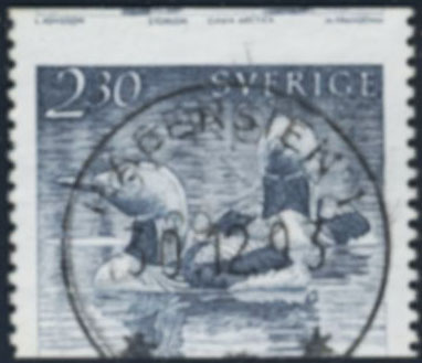 Sweden. Facit 1395v used, 1986 Water Birds 2.30 Kr black-blue. Heavily mis-cut with parts of two stamps.
