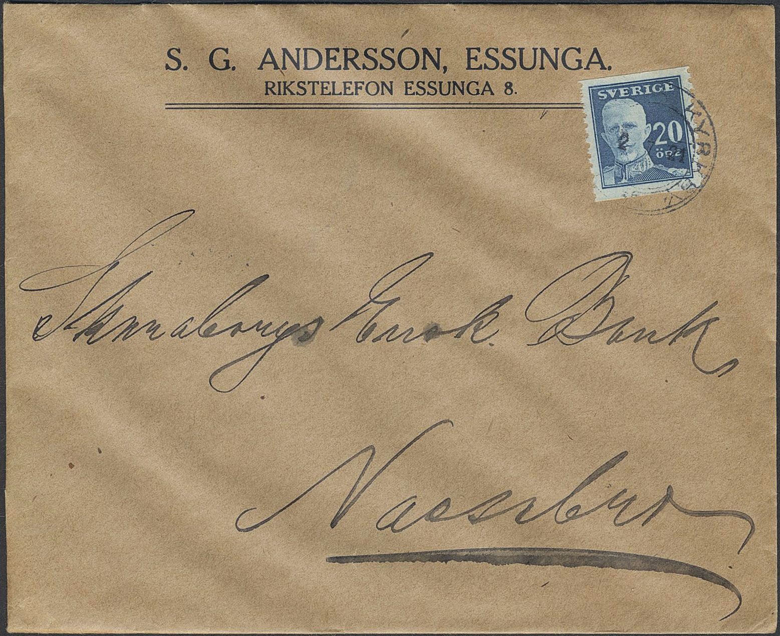 Sweden. Facit 151A, R county. ESSUNGA KYRKBY 1.7.21. Cover sent via SKARA 2.7.1921 to Nossebro. Postal: 1200:-