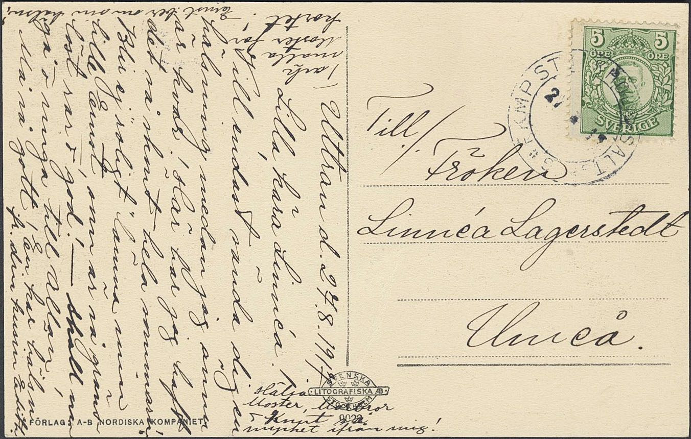 Sweden. Facit 79, A county. FKMB STOCKHOLM-SALTSKOG 27.8.17. Postcard sent to Umeå. Only year for this postmark. Postal: 400:-