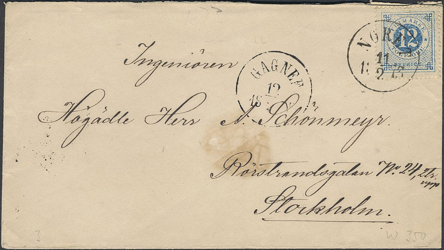 Sweden. Facit 21, W county. NORET 11.2.1873. Cover sent via GAGNEF 12.2.1873 to STOCKHOLM 1.TUR 14.2. Postal: 300:-