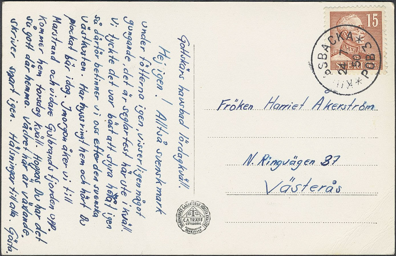 Sweden. Facit 275A, N county. KUNGSBACKA POB 3 24.7.50, postal agency postmark. Postcard sent to Västerås. Postal: 1200:-