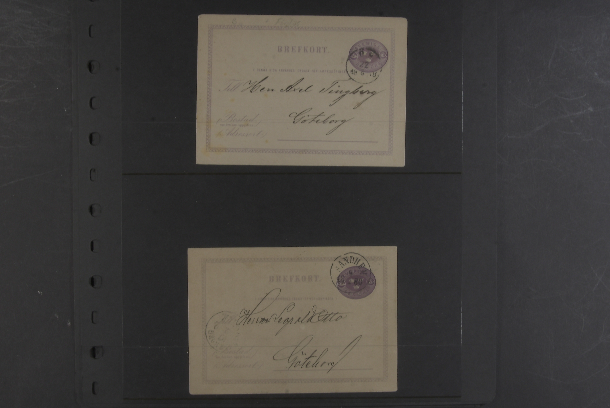 Sweden. Postal stationery, Single postcard, Facit bKe2 v.II, bKd1 v.V, Variety 'Two value stamps, one colourless' – two used single cards type B, one used CI and one unused CII, plus unused double cards type CI+AI (dirty) and CII+CII. The entire lot is presented at www.philea.se. SEK 21000