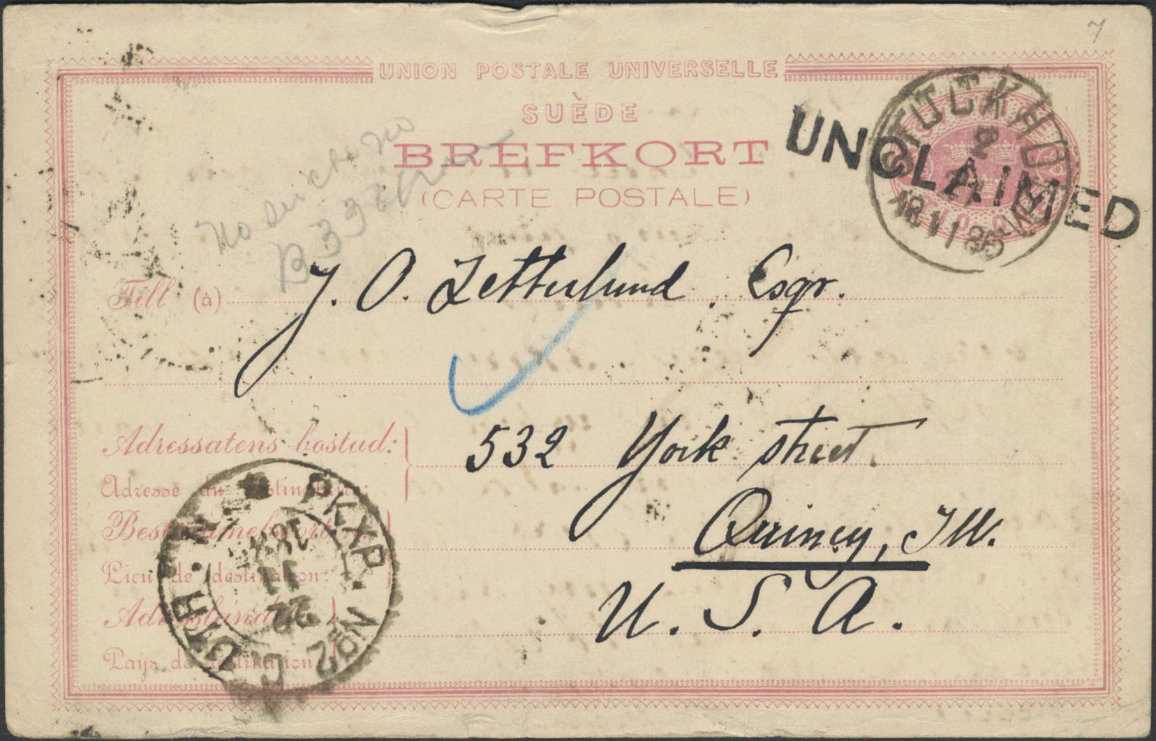 Sweden. Postal stationery, Single postcard, Facit bKe4, Postcard 10 öre sent from STOCKHOLM 21.11.1885 to USA. Undeliverable with cancells UNCLAIMED and DEAD LETTER OFFICE 8.JAN. SEK 1800+