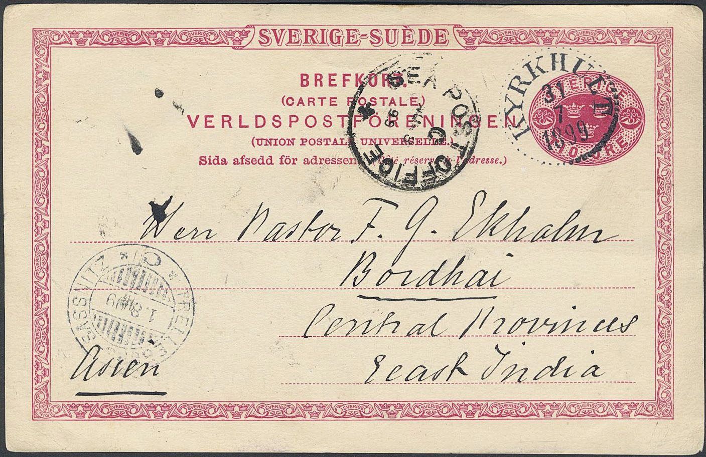 Sweden. Postal stationery, Single postcard, Facit bKe13, Postcard 10 öre sent from KYRKHULT 31.7.1899 via TRELLEBORG–SASSNITZ C 1.8.99 and SEA POST OFFICE C 3.AU.99 to East India.