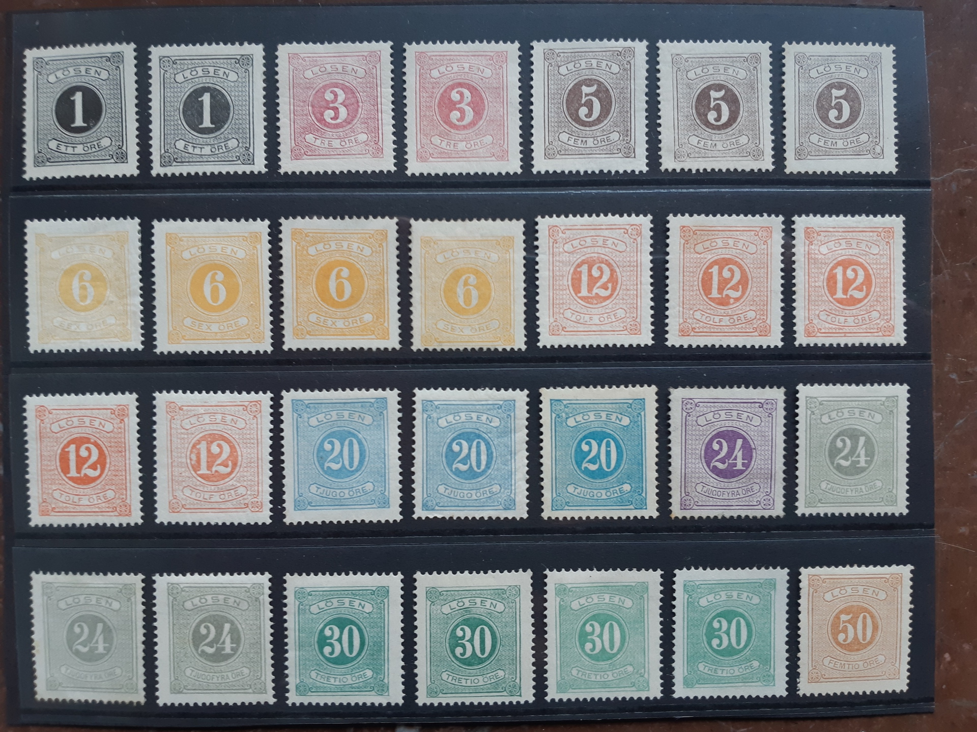 Sweden. Collection ★★/★ POSTAGE DUES 14. Incl. several different shades, also better – seven stamps with opionions (shades) by O.P. Somewhat mixed quality, but also fine, well centered stamps. High catalogue value. Please inspect. (28)