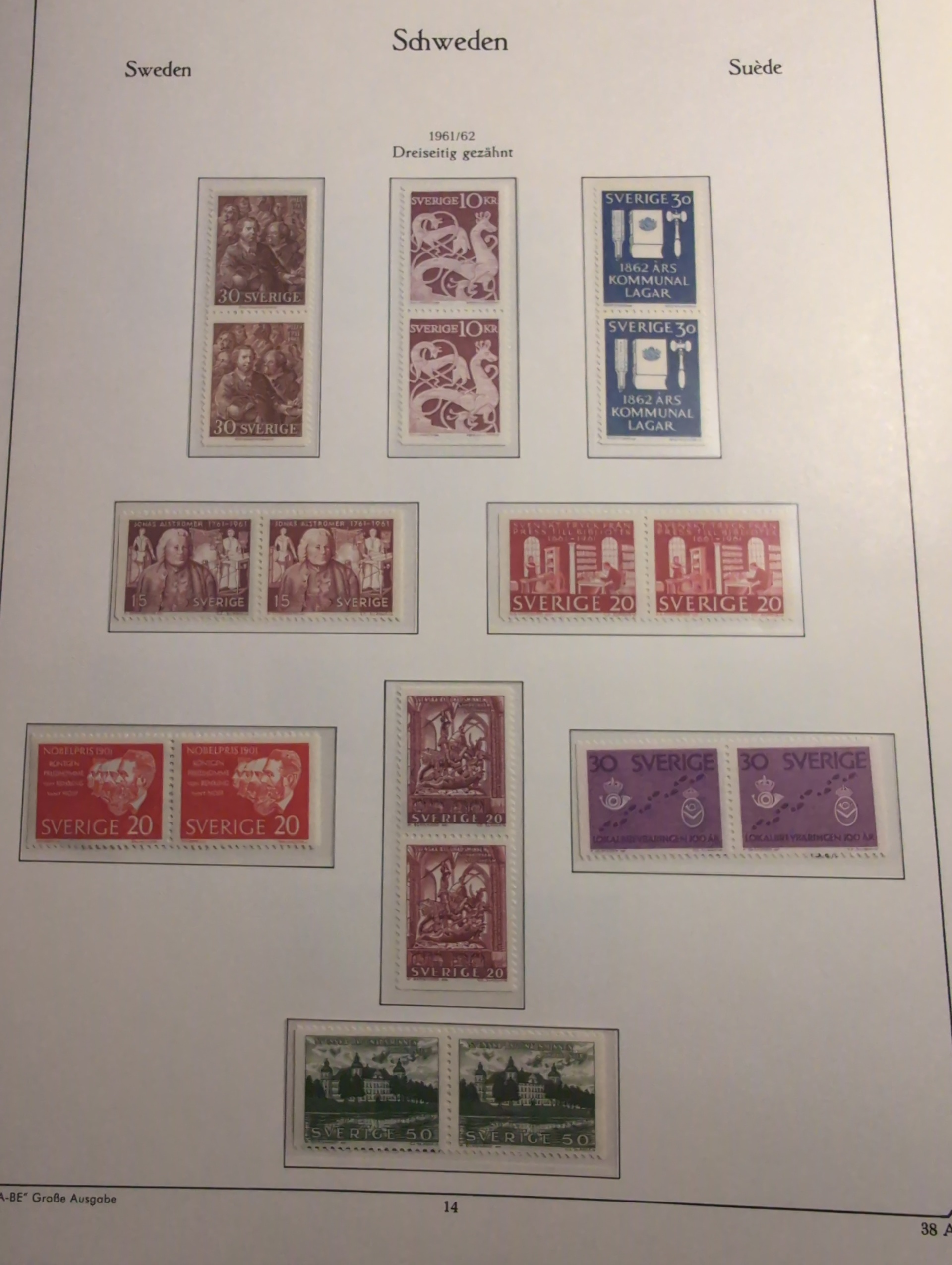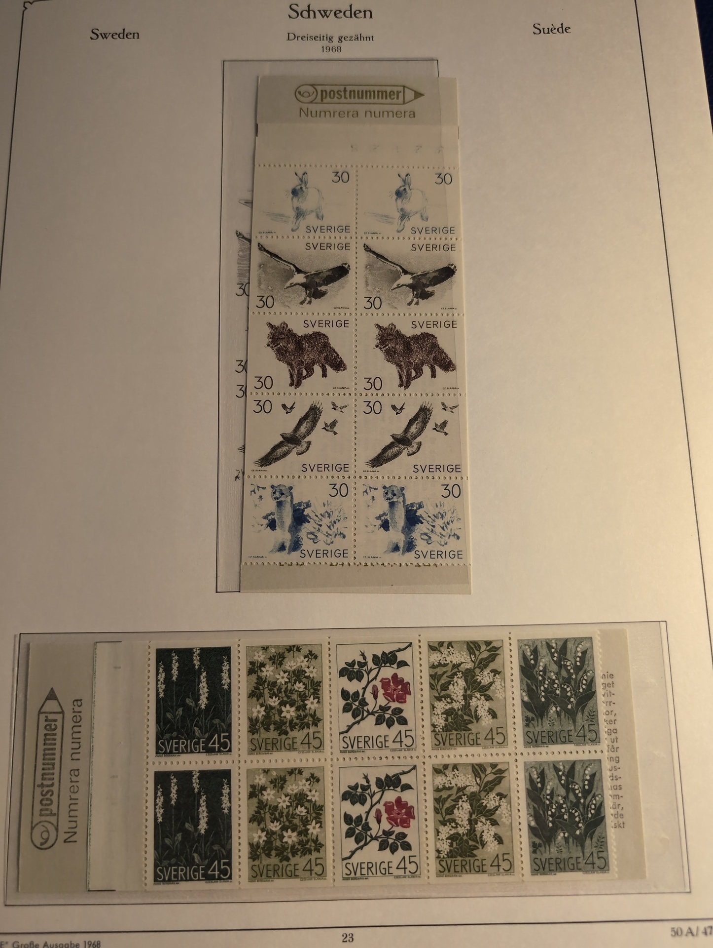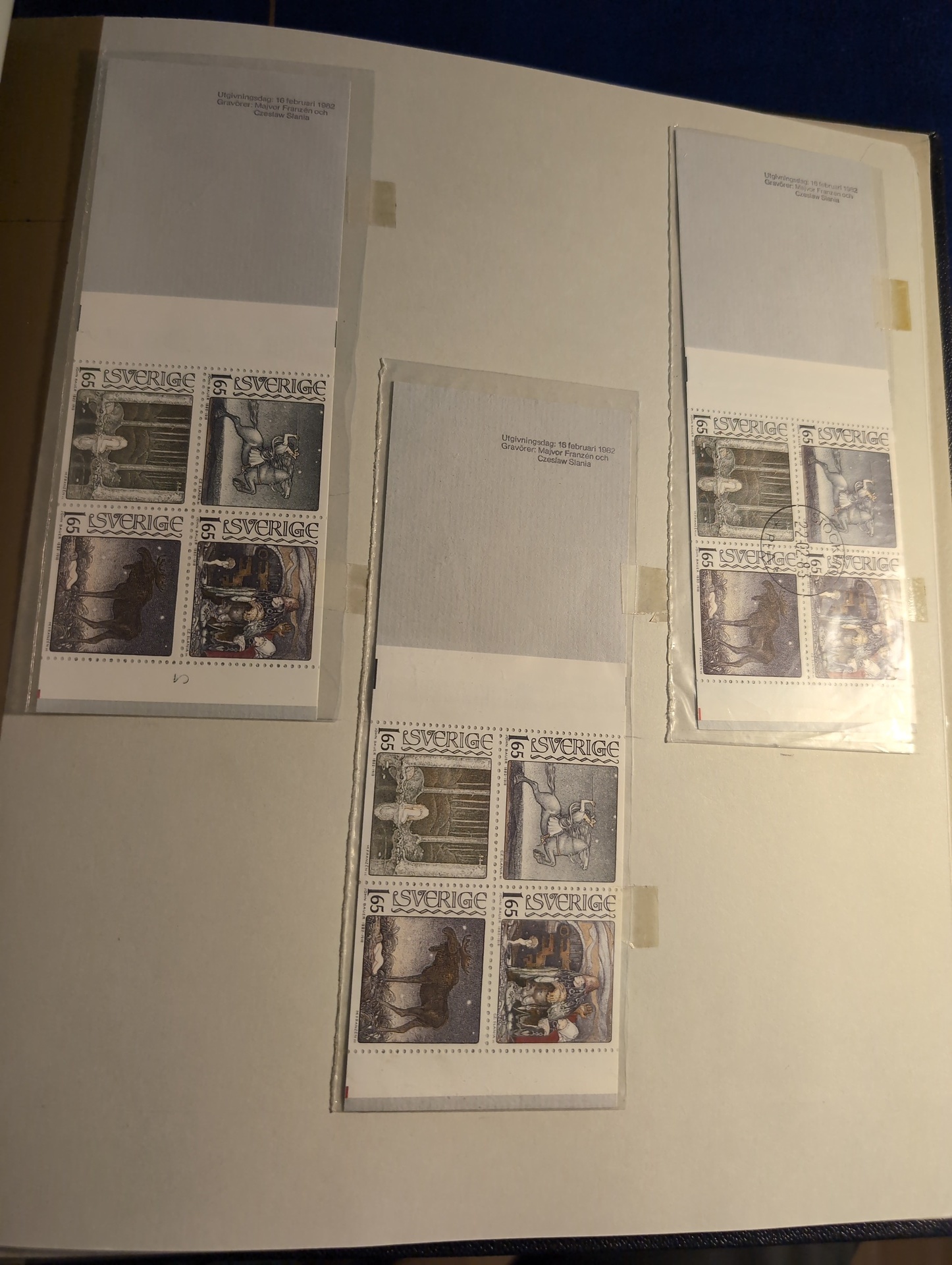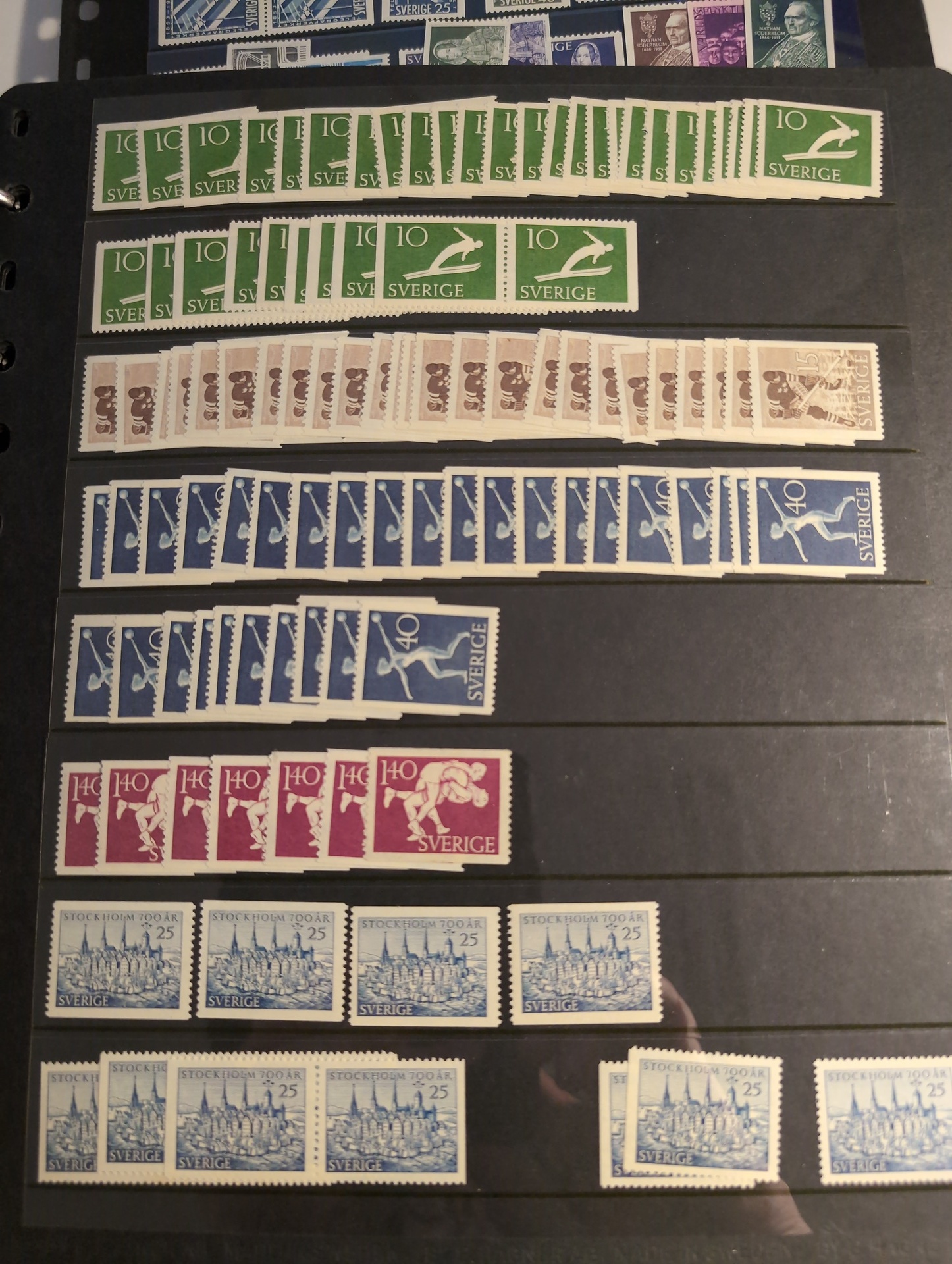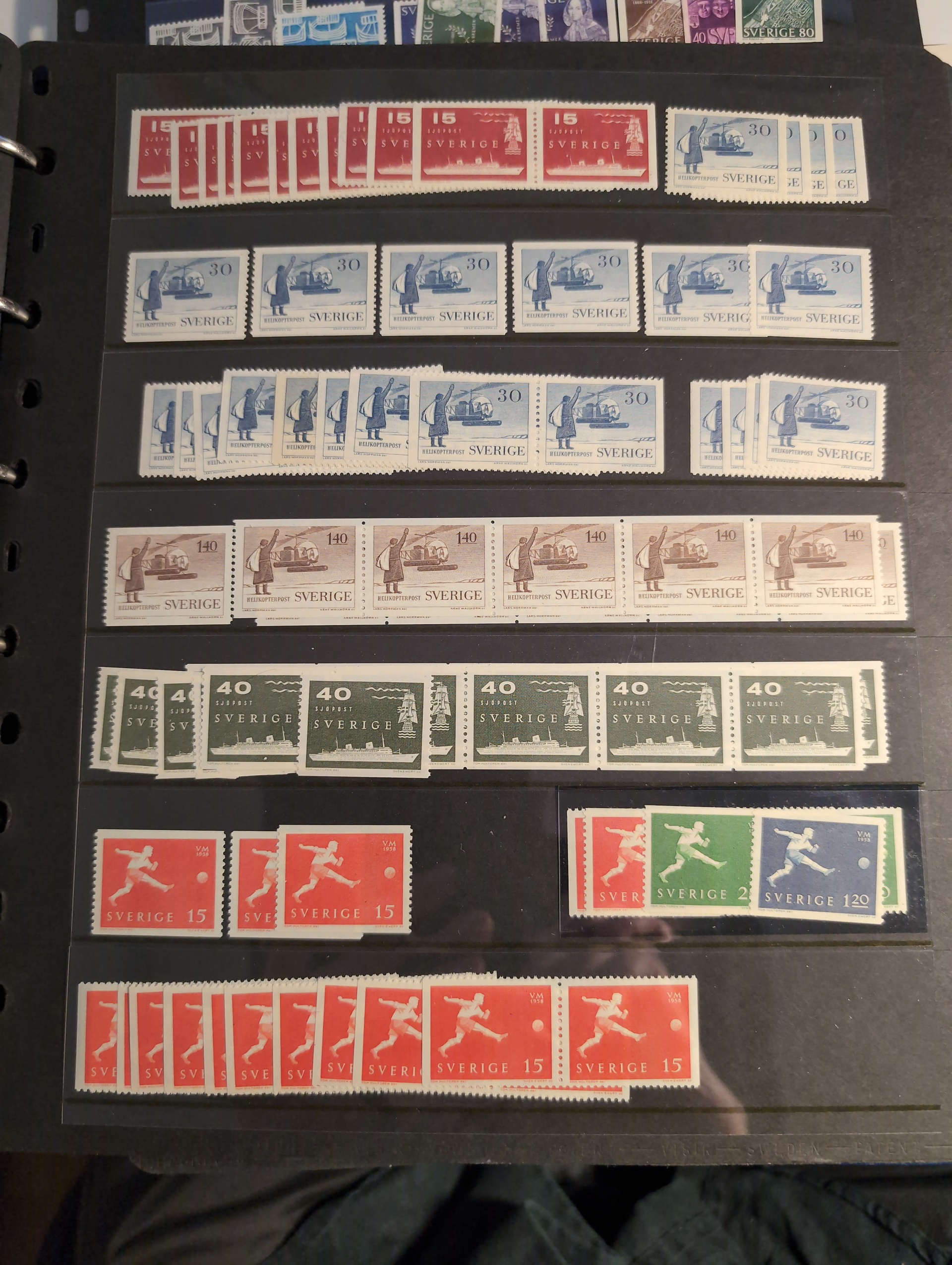 Sweden. Accumulation ★★ 1940s–1980s in box. Two collections Sweden mnh 1940s–1980s with some booklets, One visir binder with stock material 1940s–1970s with plenty of high denominations from the 1950s. Please see a selection of scans at www.philea.se. Mostly fine quality. Approx. 6 kg. (1000s)