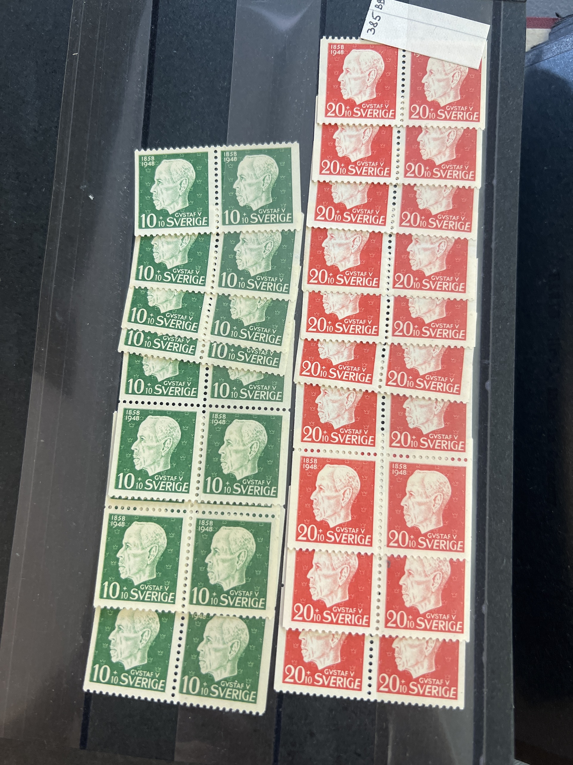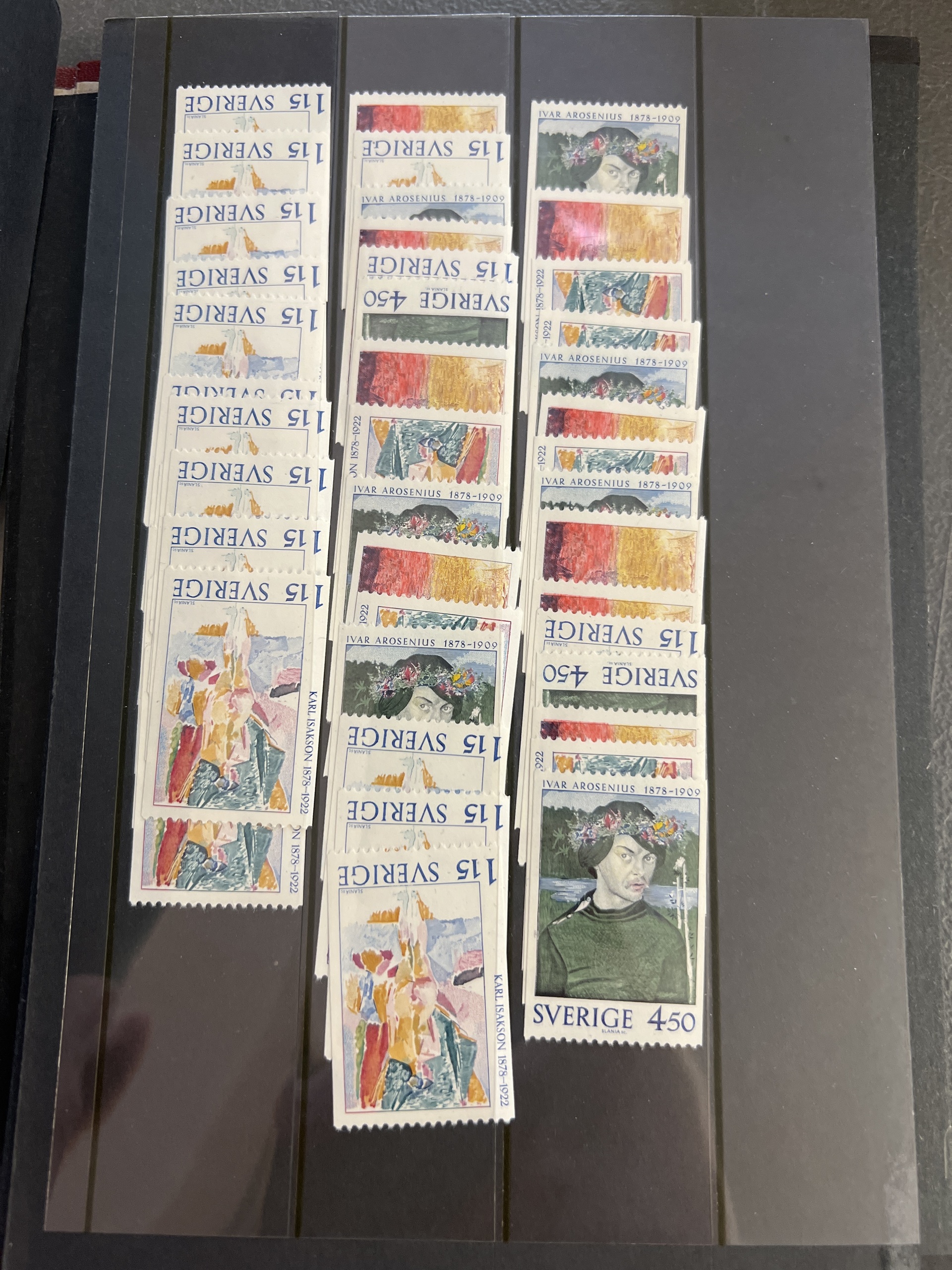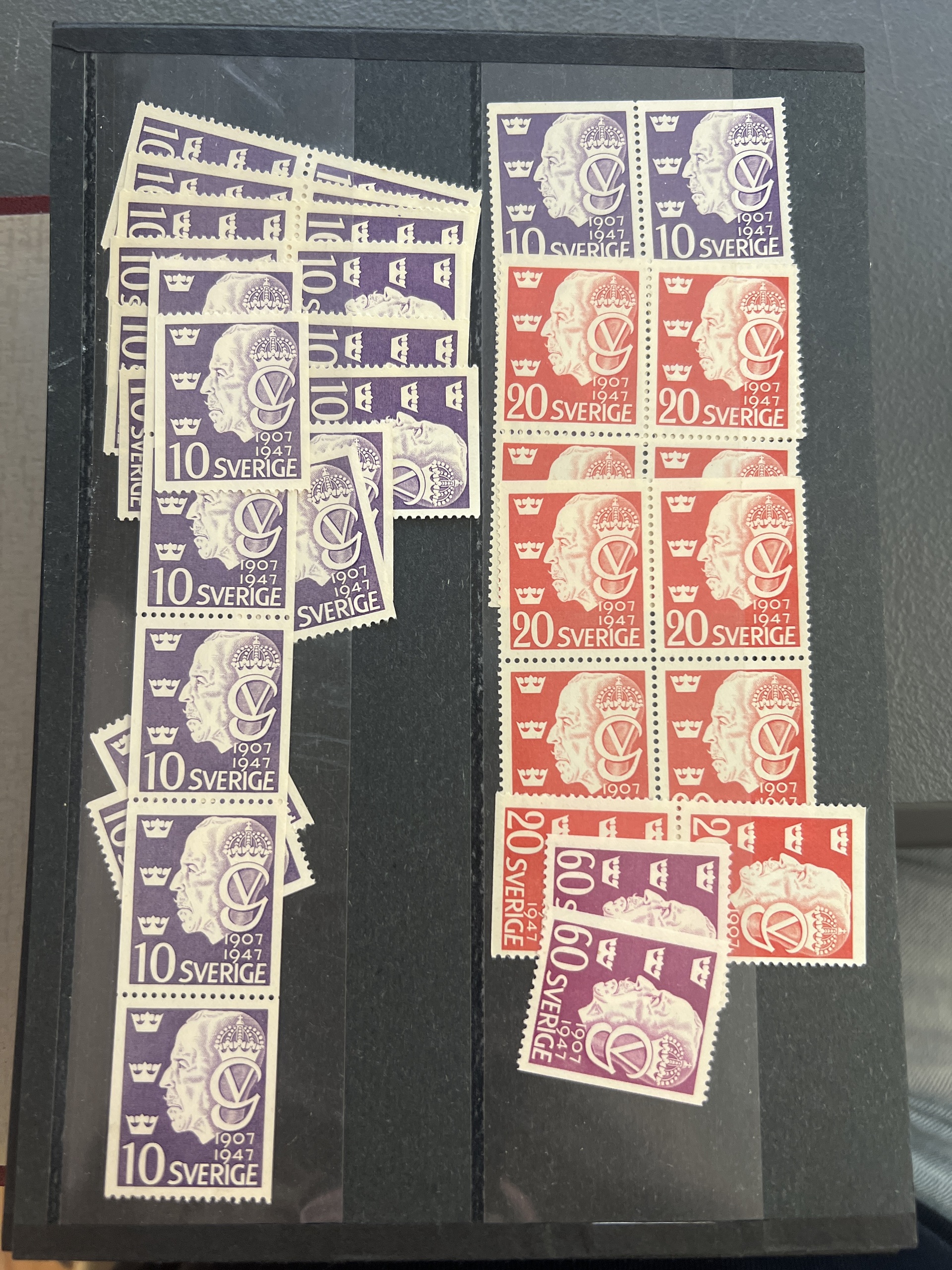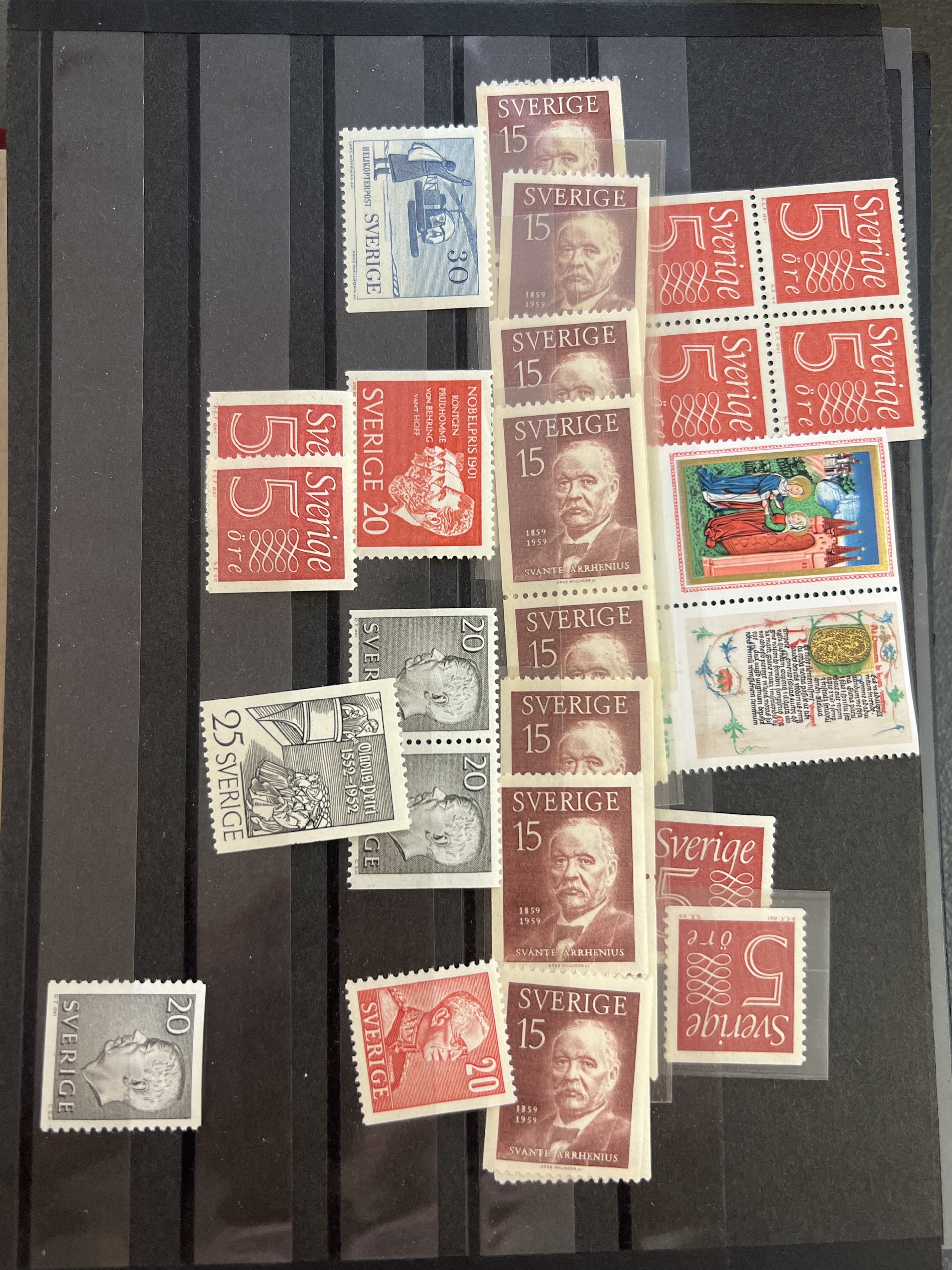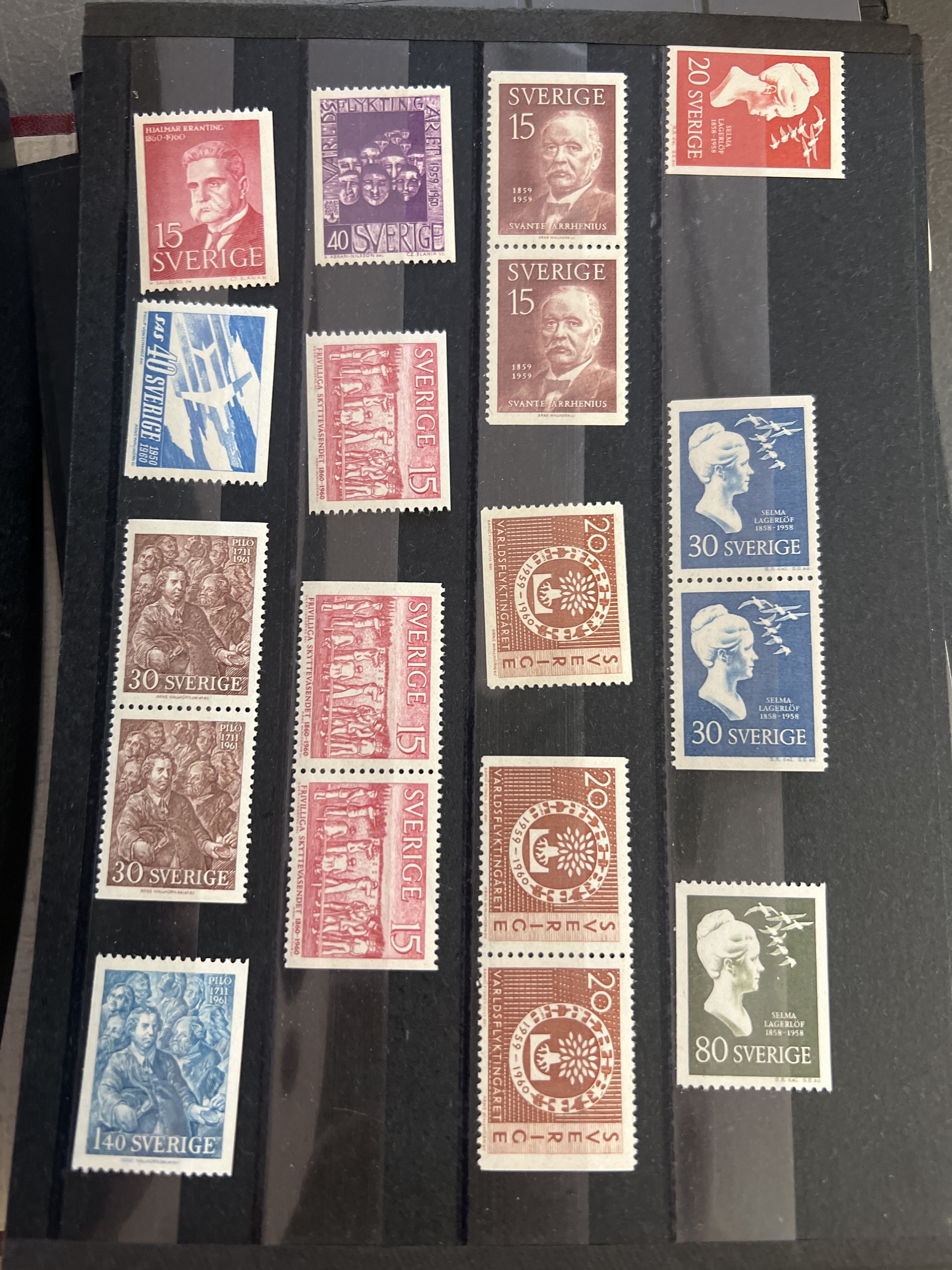 Sweden. Accumulation ★★ 1910–1960 in box. Two archive boxes with approximately 100 stock cards containing single stamps, sets, strips up to five stamps, etc. Stock material. Excellent quality. (many 100)