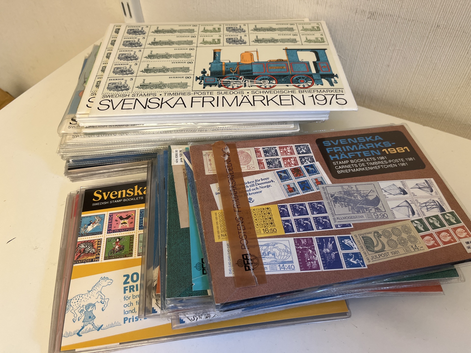 Sweden. Year sets, accumulation. 1975–84 (2), 1985, 86–87 (2) and 1988 (3) and booklets 1981–83, 1984–85 (2), 1986 (3), 1987 (2), 1988 (3), incl. 15 discount stamp booklets + stamps + face value ca. 2.000. Most opened.