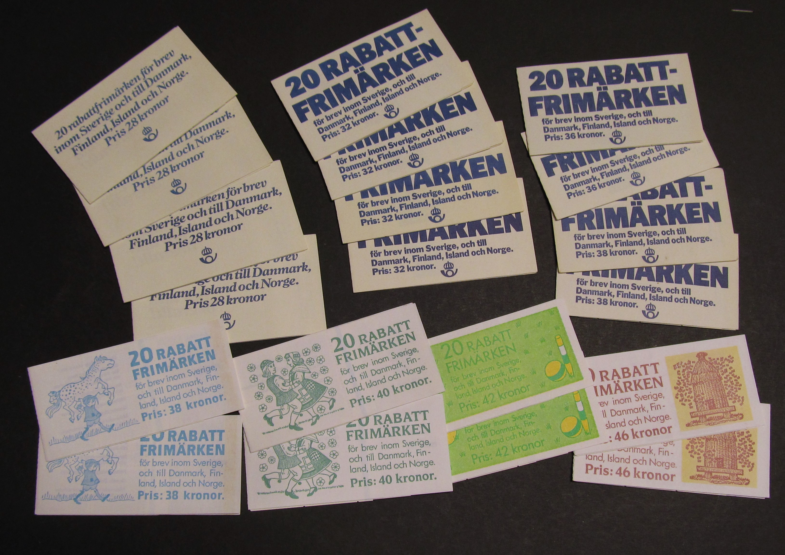 Sweden. Discount stamp booklets, lot 1981-1990. Two of each, twenty in total, valid to the Nordic countries. Very fine condition. The entire lot is presented at www.philea.se. (20)
