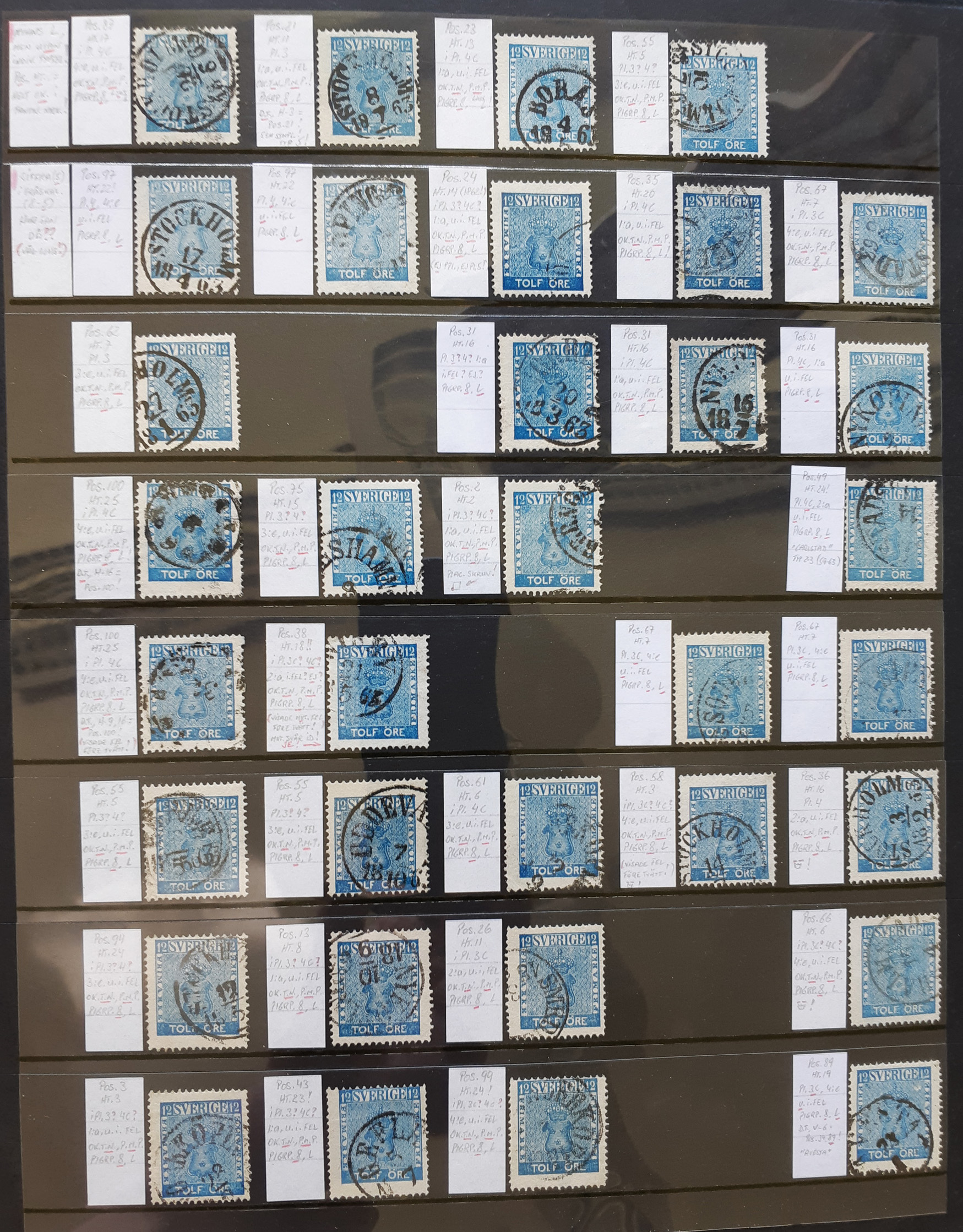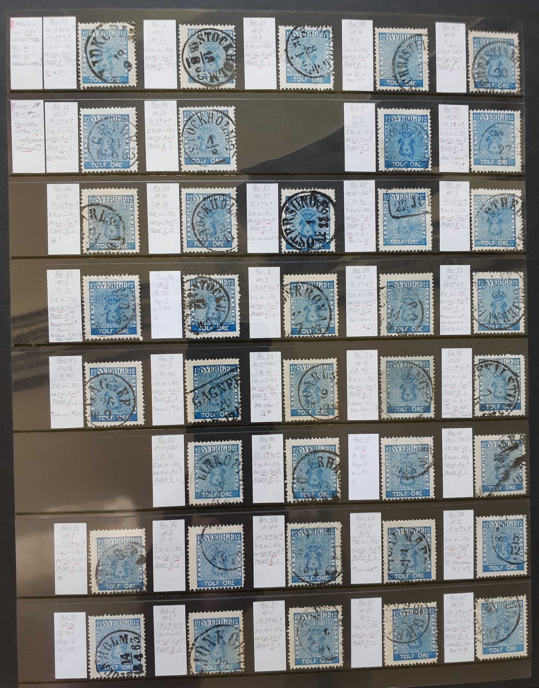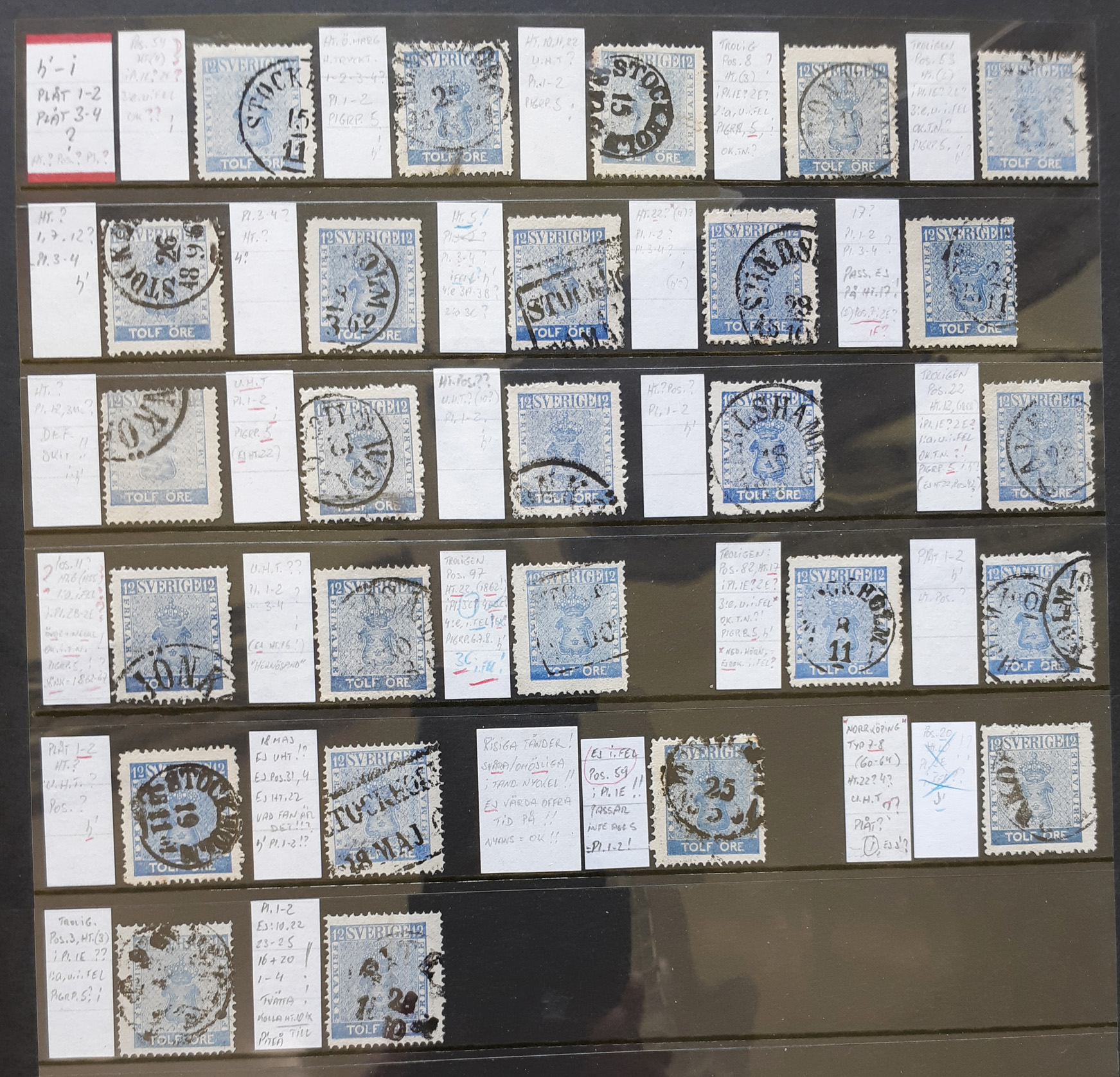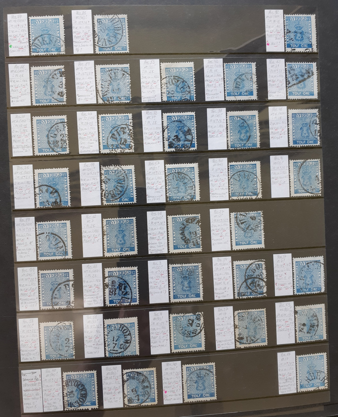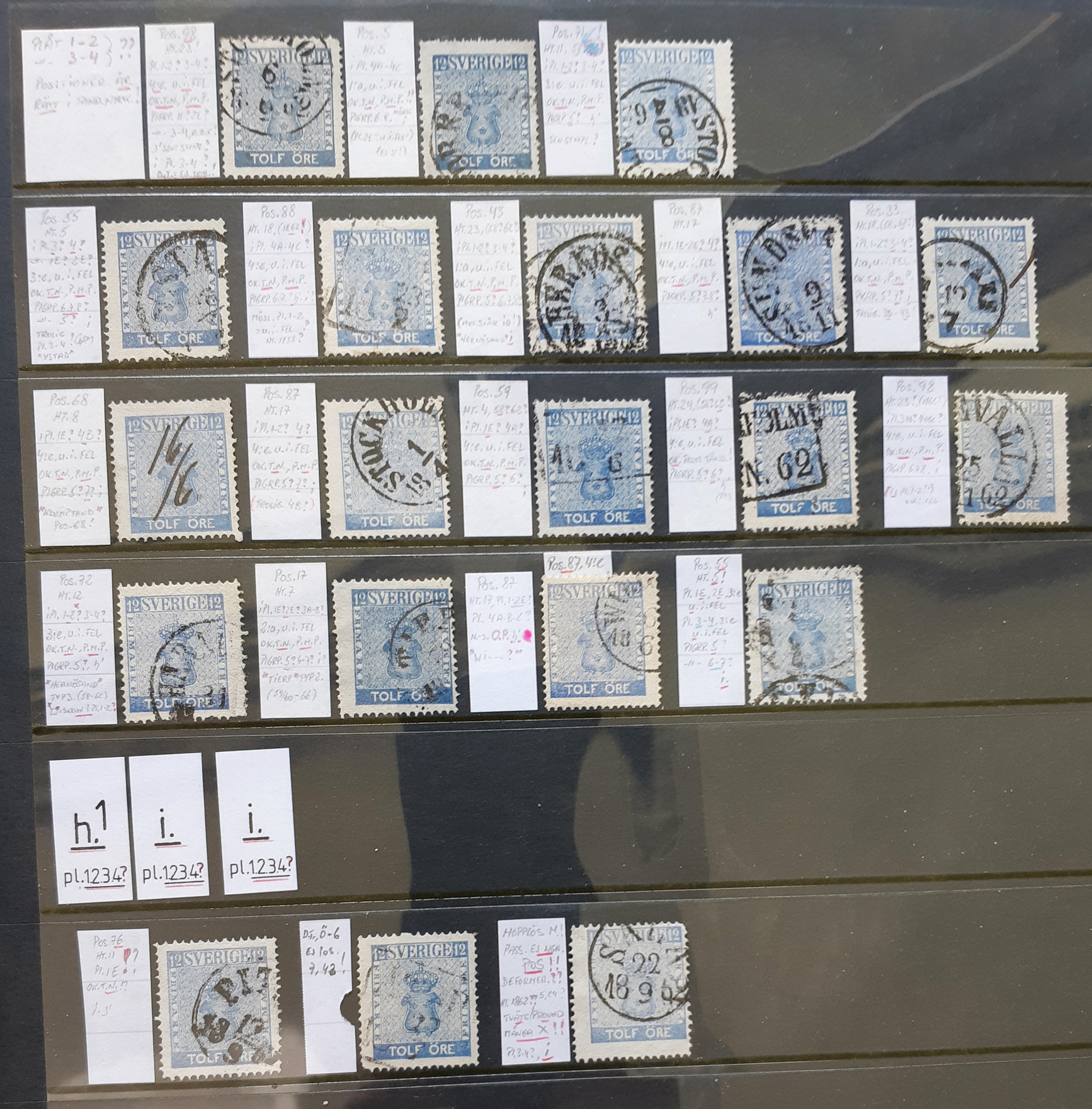 Sweden. Collection used 12 ÖRE COAT-OF-ARMS in albums, etc. in box. Interesting study of this popular stamp. Most identified with shades, main types and positions in the plates, plus some cancellations, covers, etc. Please see a selection of scans at www.philea.se. (>1200)