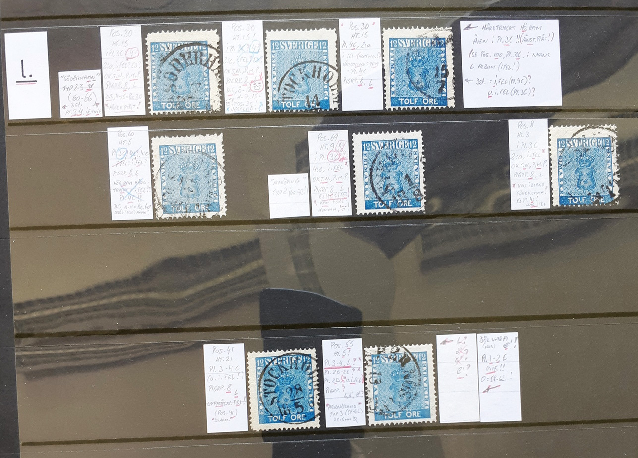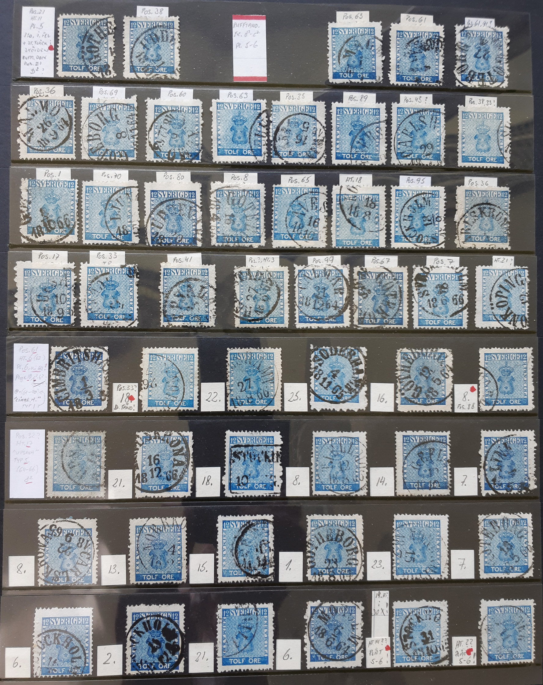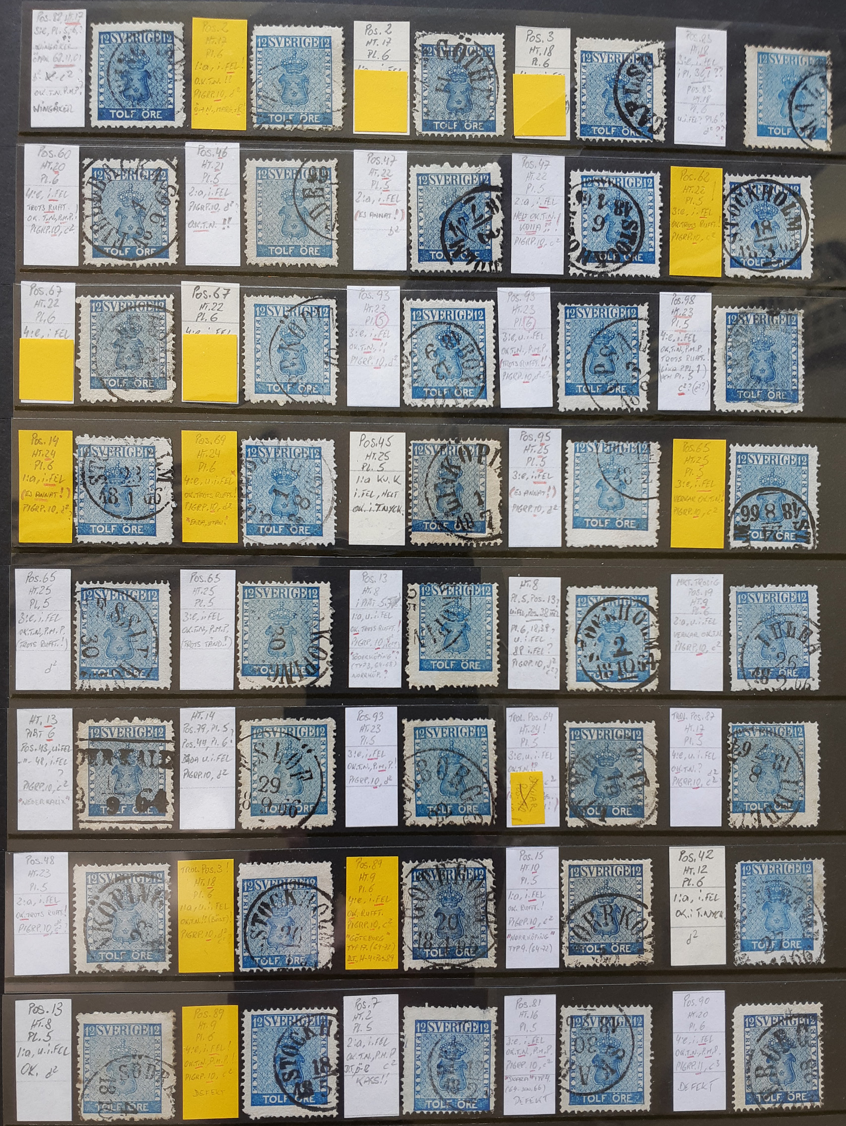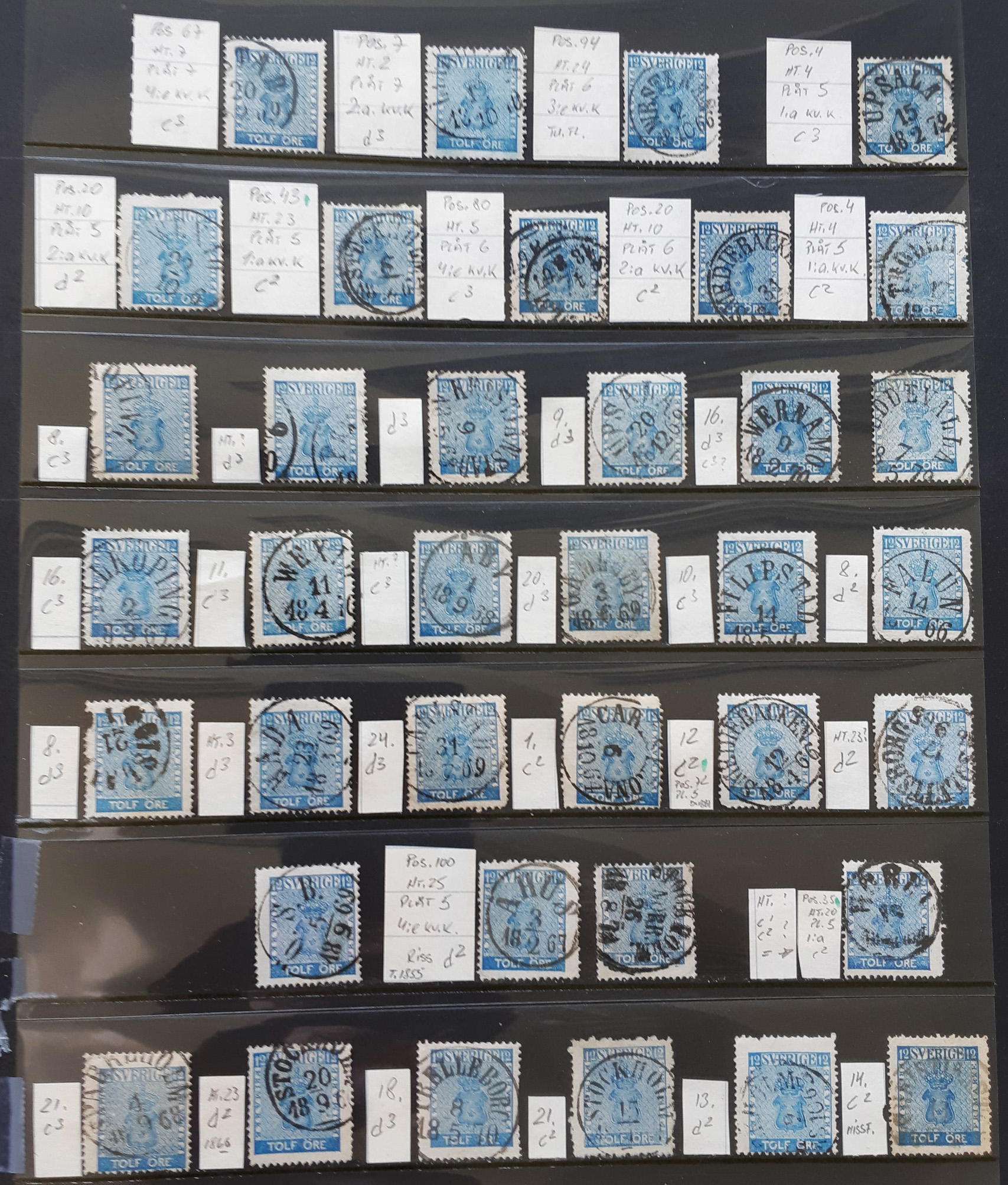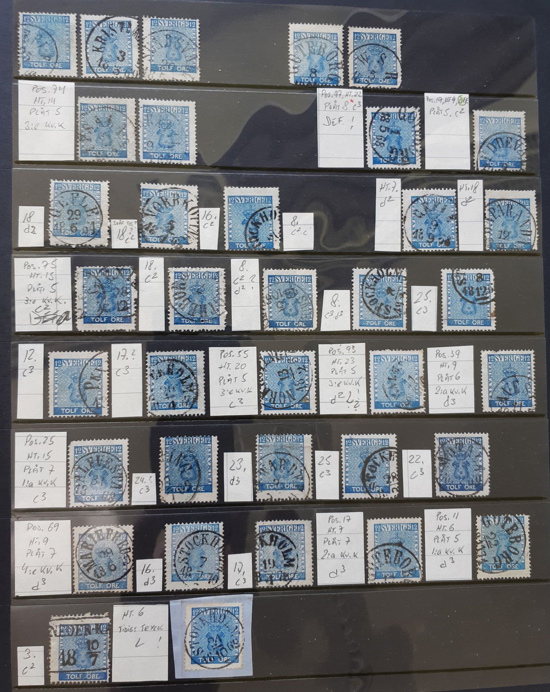 Sweden. Collection used 12 ÖRE COAT-OF-ARMS in albums, etc. in box. Interesting study of this popular stamp. Most identified with shades, main types and positions in the plates, plus some cancellations, covers, etc. Please see a selection of scans at www.philea.se. (>1200)