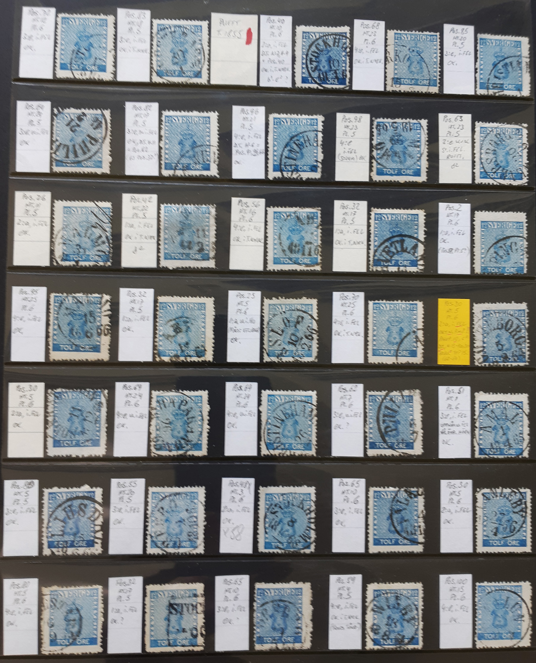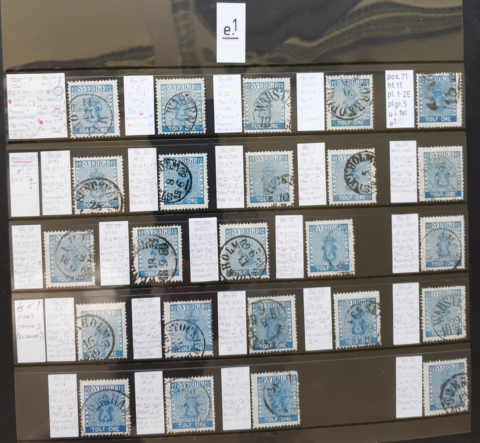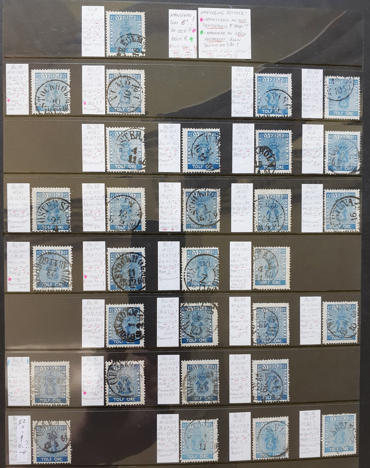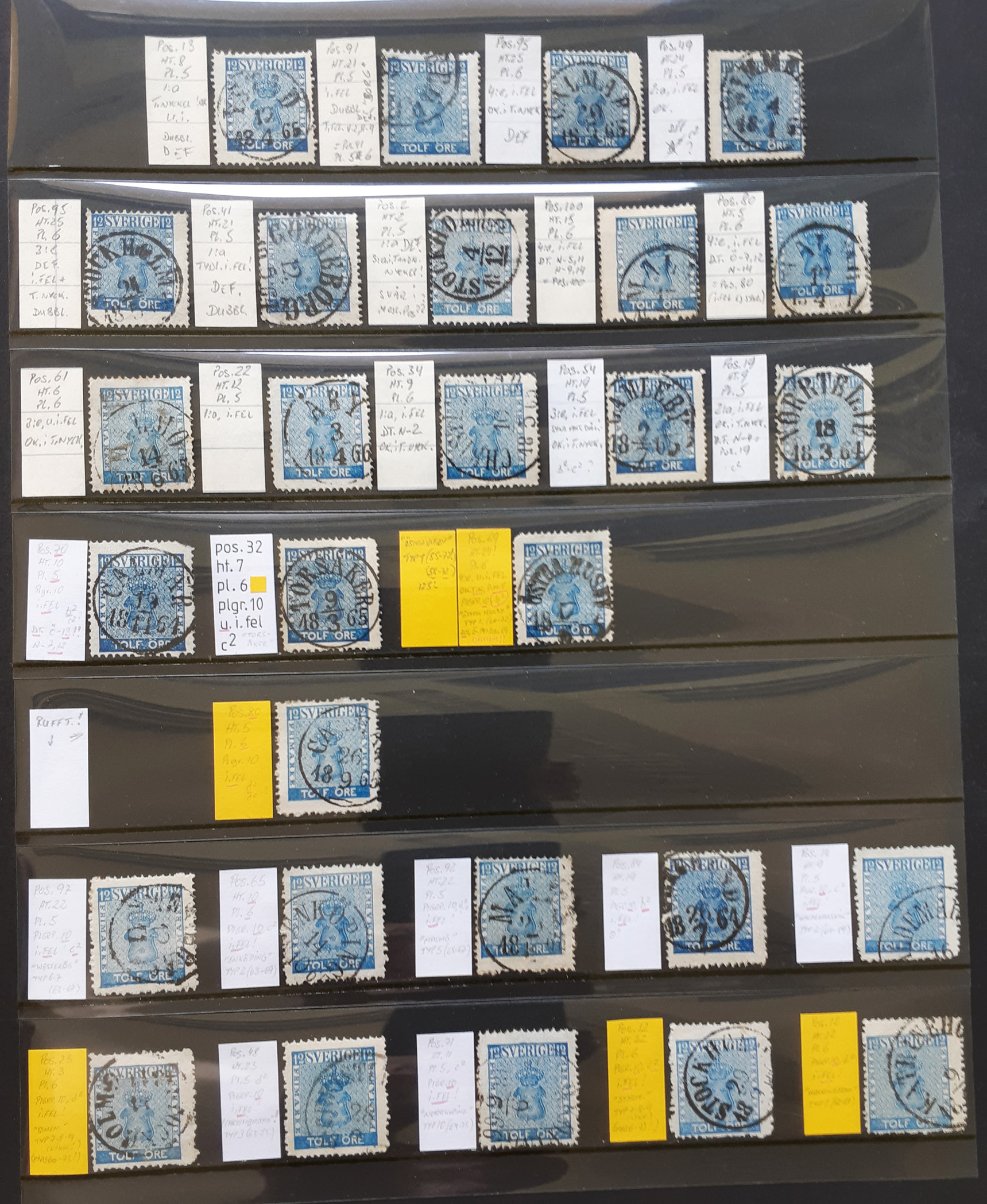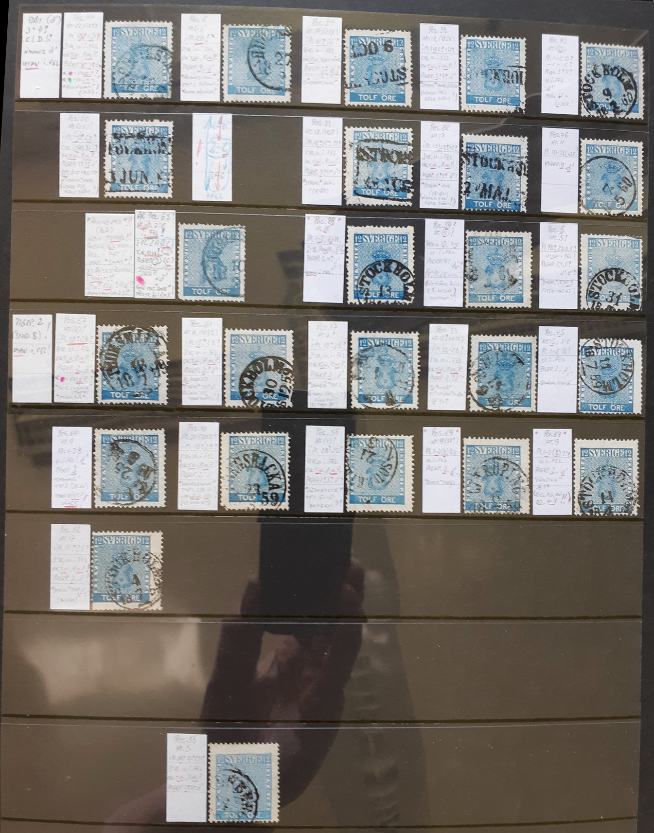 Sweden. Collection used 12 ÖRE COAT-OF-ARMS in albums, etc. in box. Interesting study of this popular stamp. Most identified with shades, main types and positions in the plates, plus some cancellations, covers, etc. Please see a selection of scans at www.philea.se. (>1200)