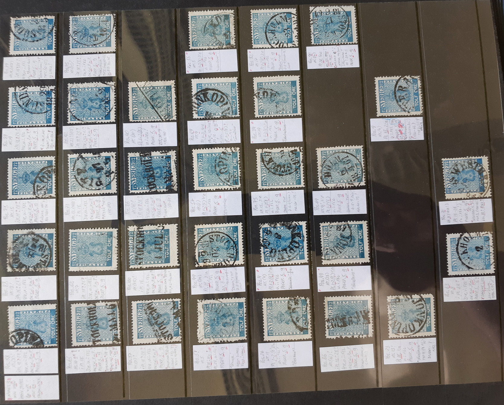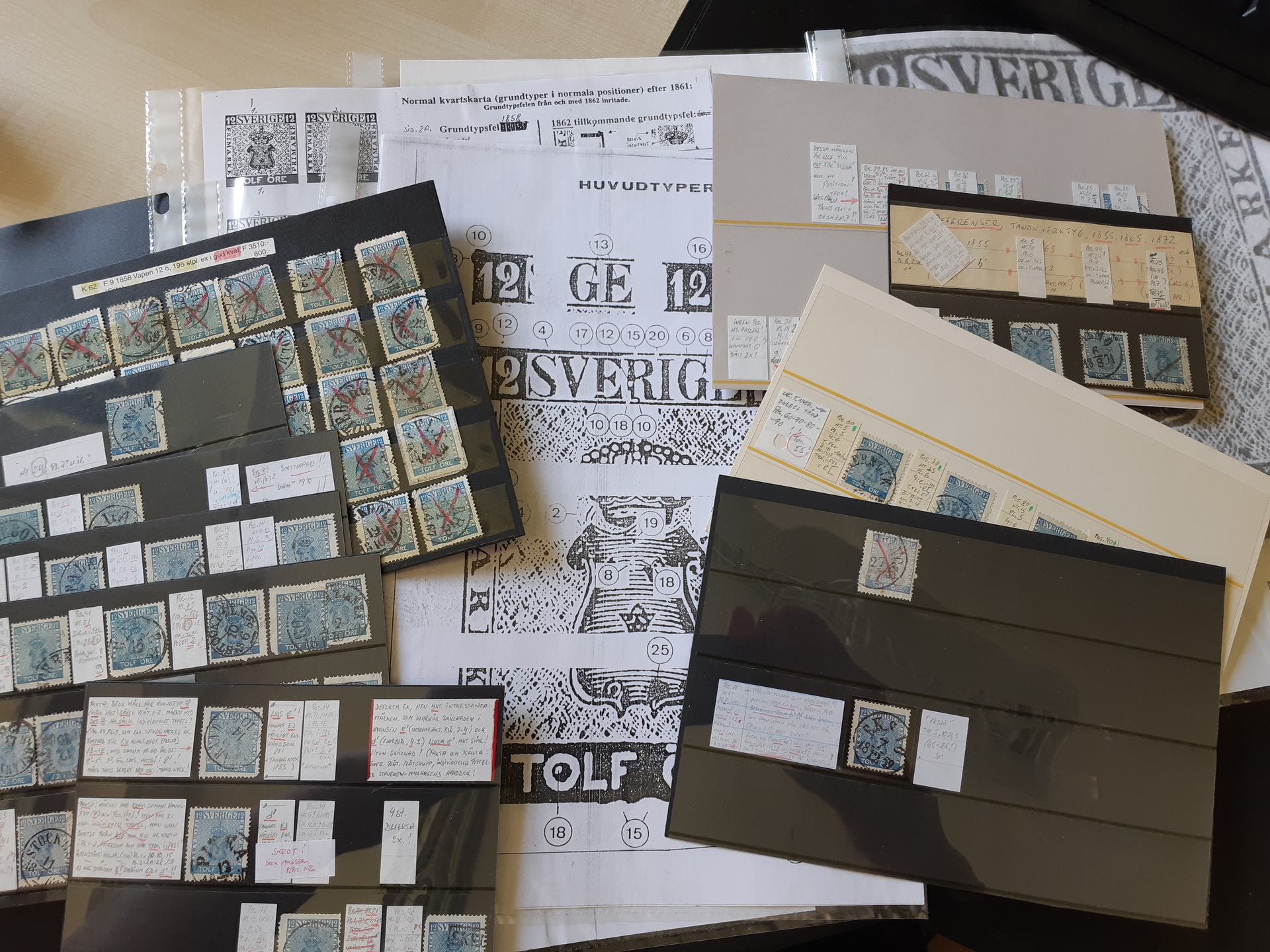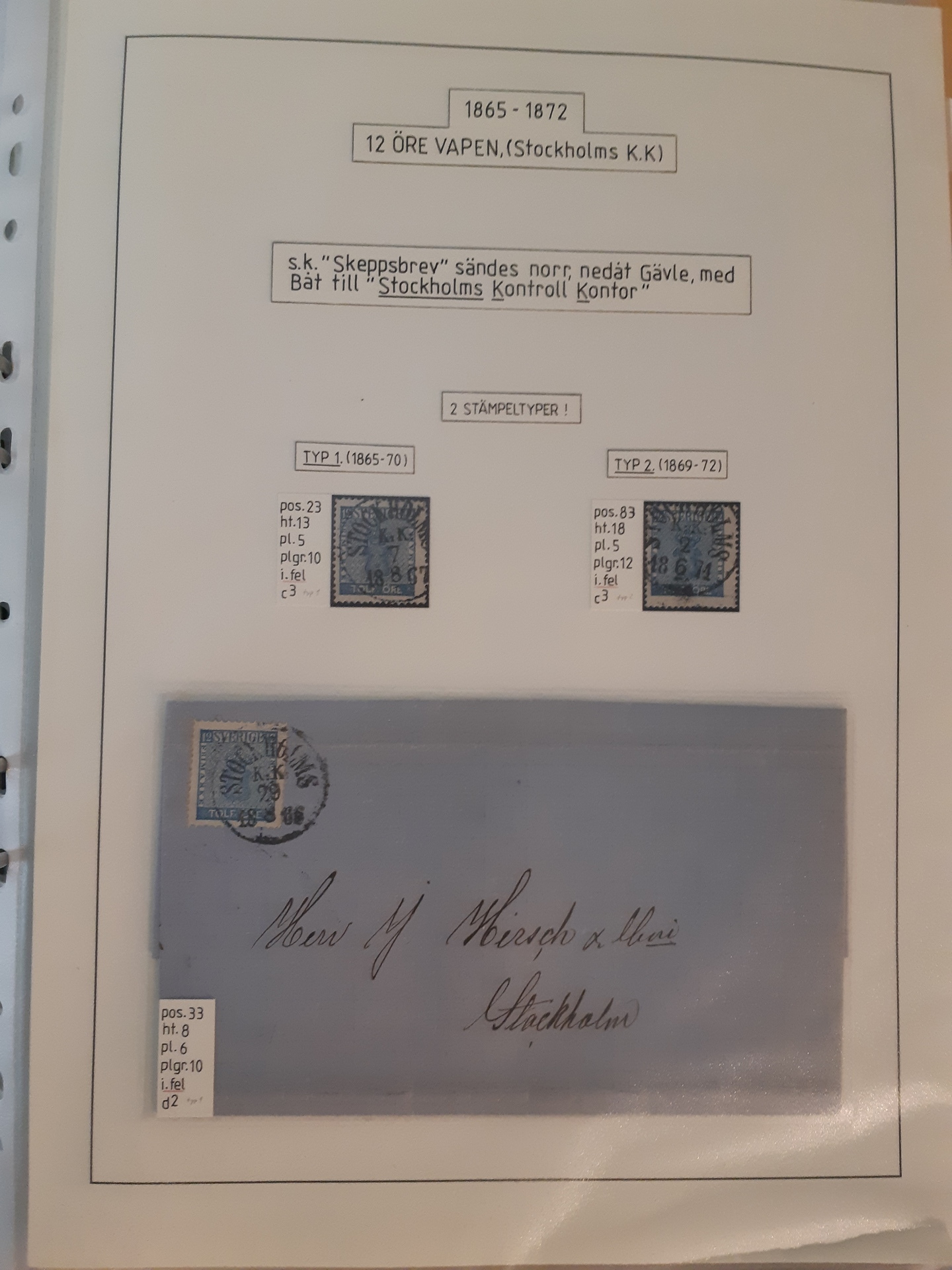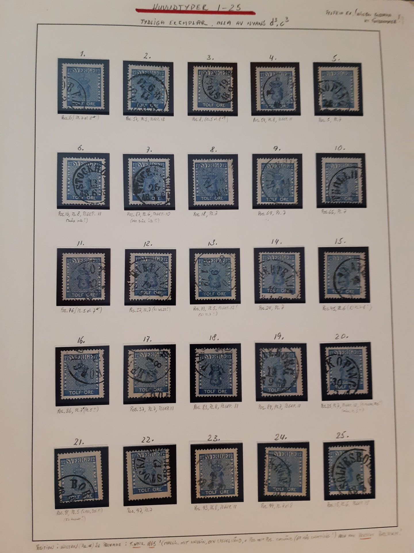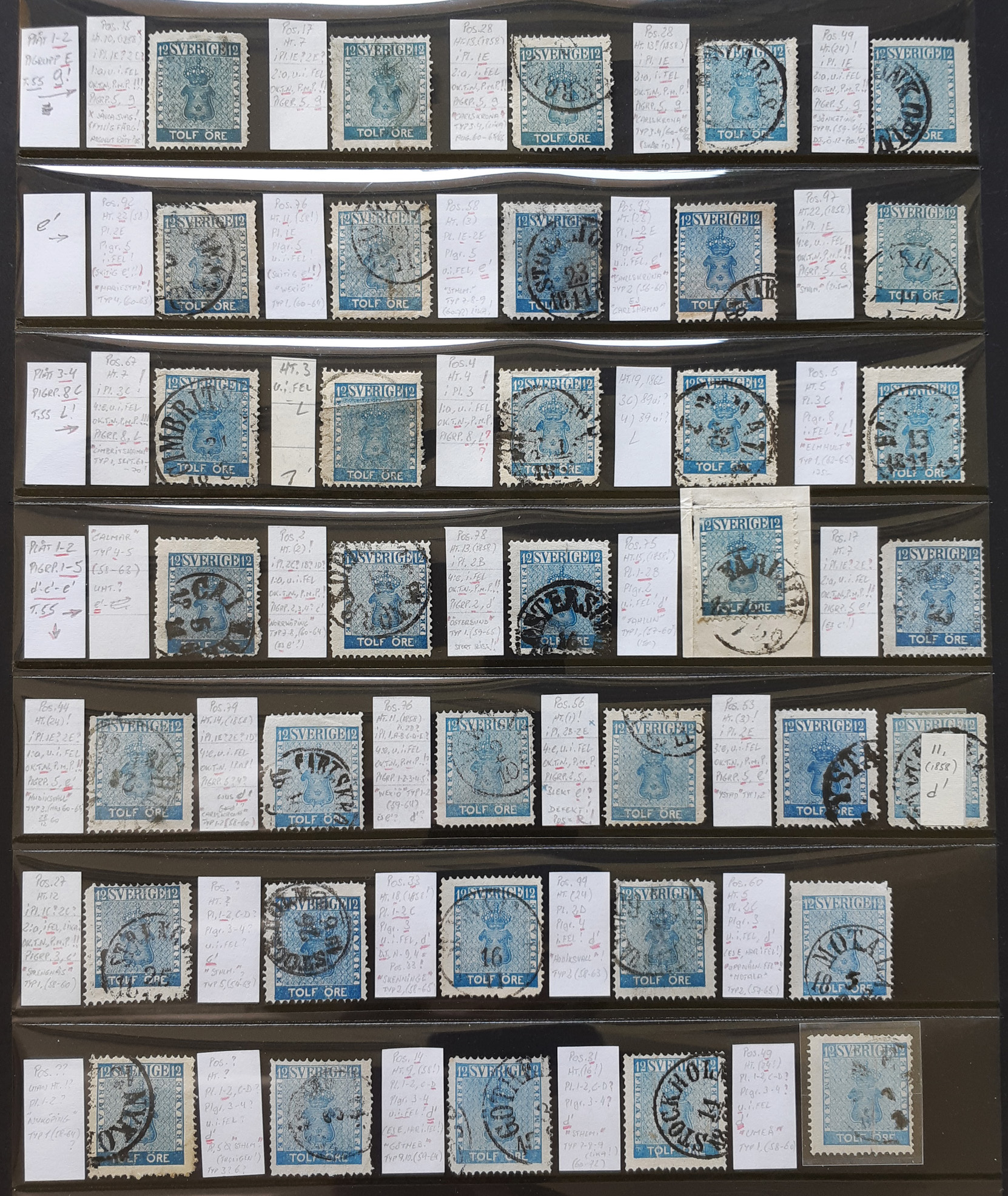 Sweden. Collection used 12 ÖRE COAT-OF-ARMS in albums, etc. in box. Interesting study of this popular stamp. Most identified with shades, main types and positions in the plates, plus some cancellations, covers, etc. Please see a selection of scans at www.philea.se. (>1200)