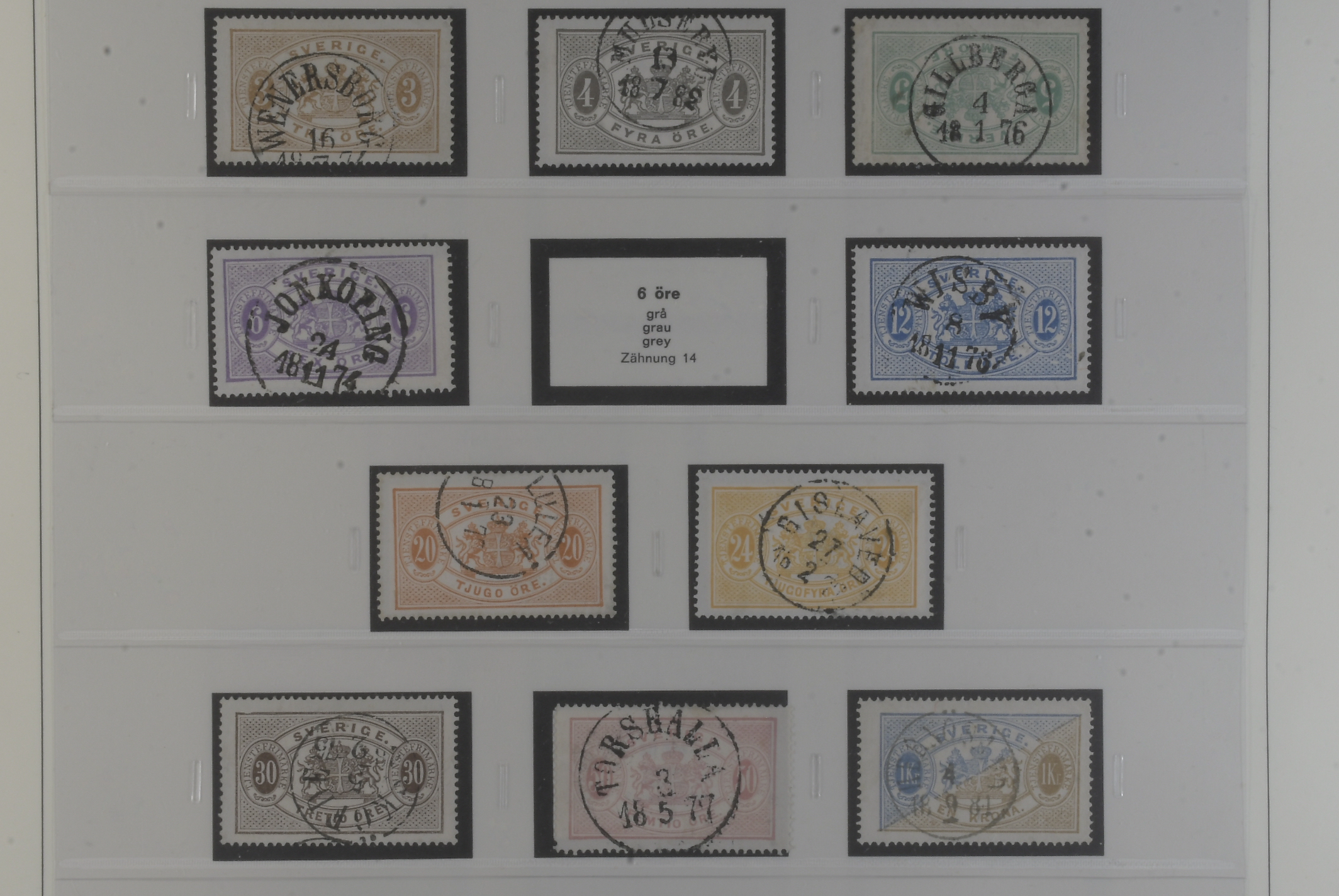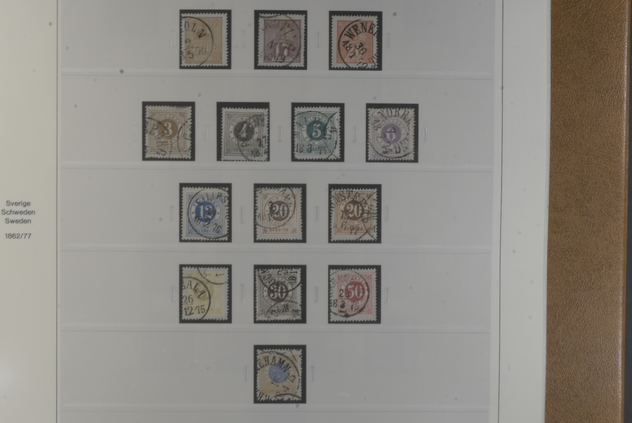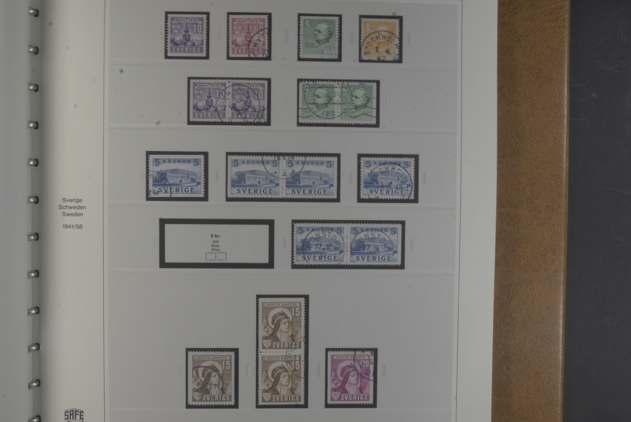 Sweden. Collection used 1855–1959 in SAFE album. Wellfilled Coat-of-arms 4s and complete set ore, good range of circle type and some better UPU. incl. both 5kr.