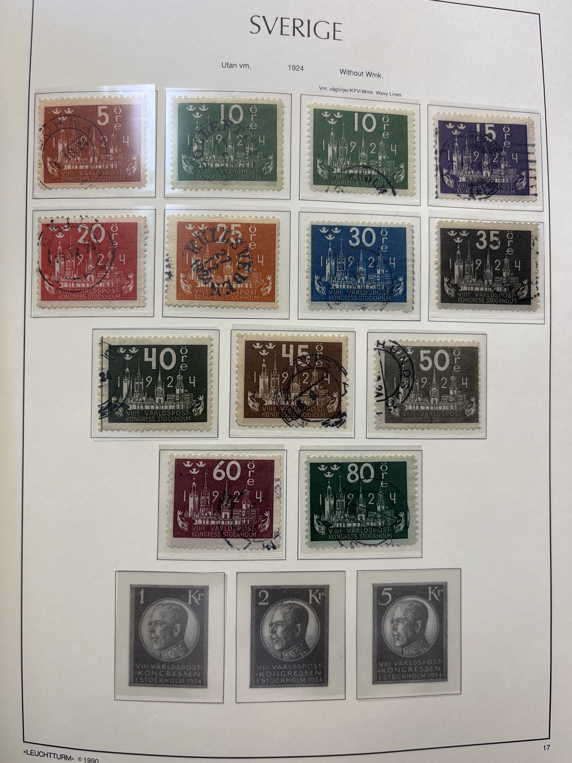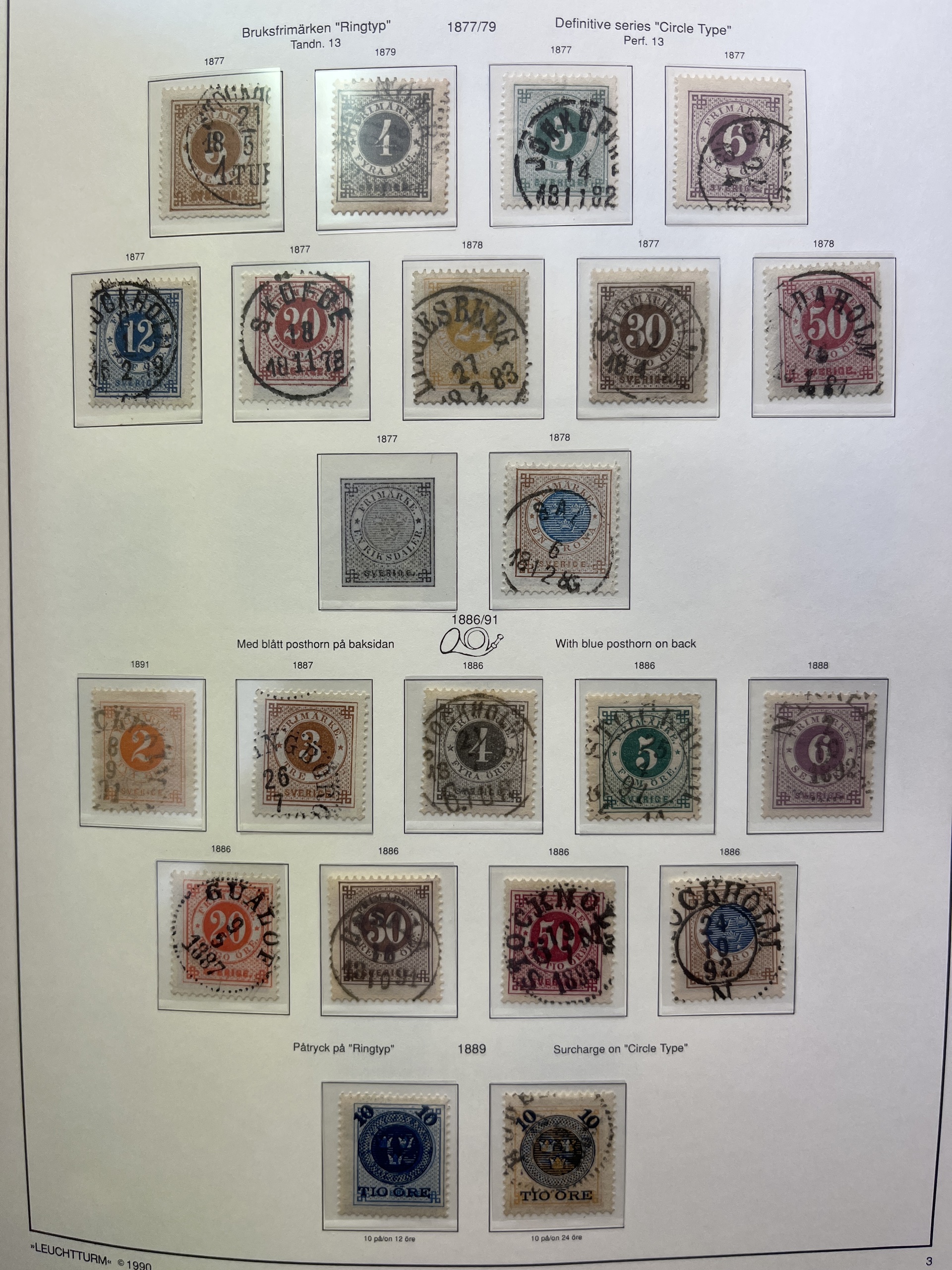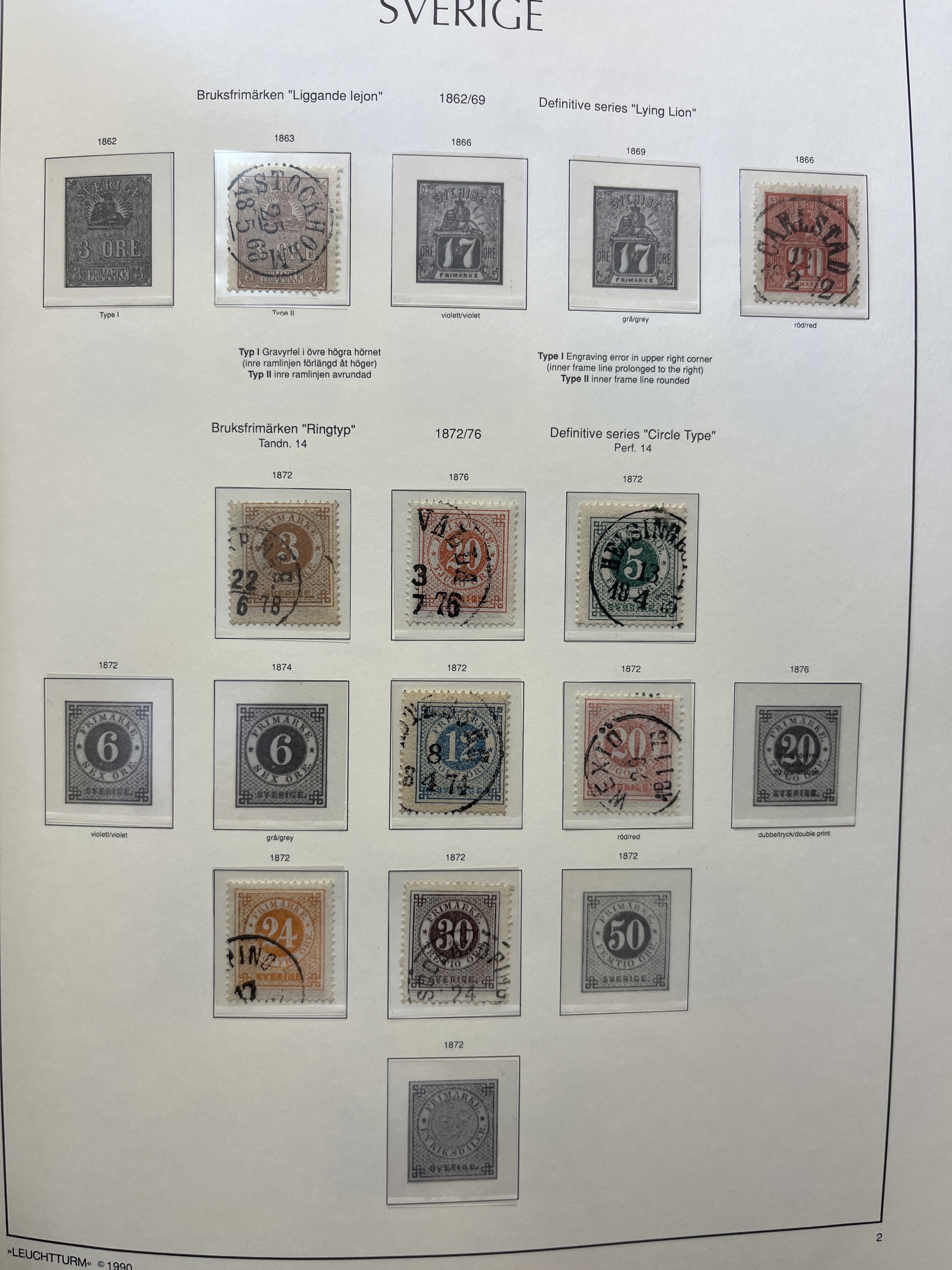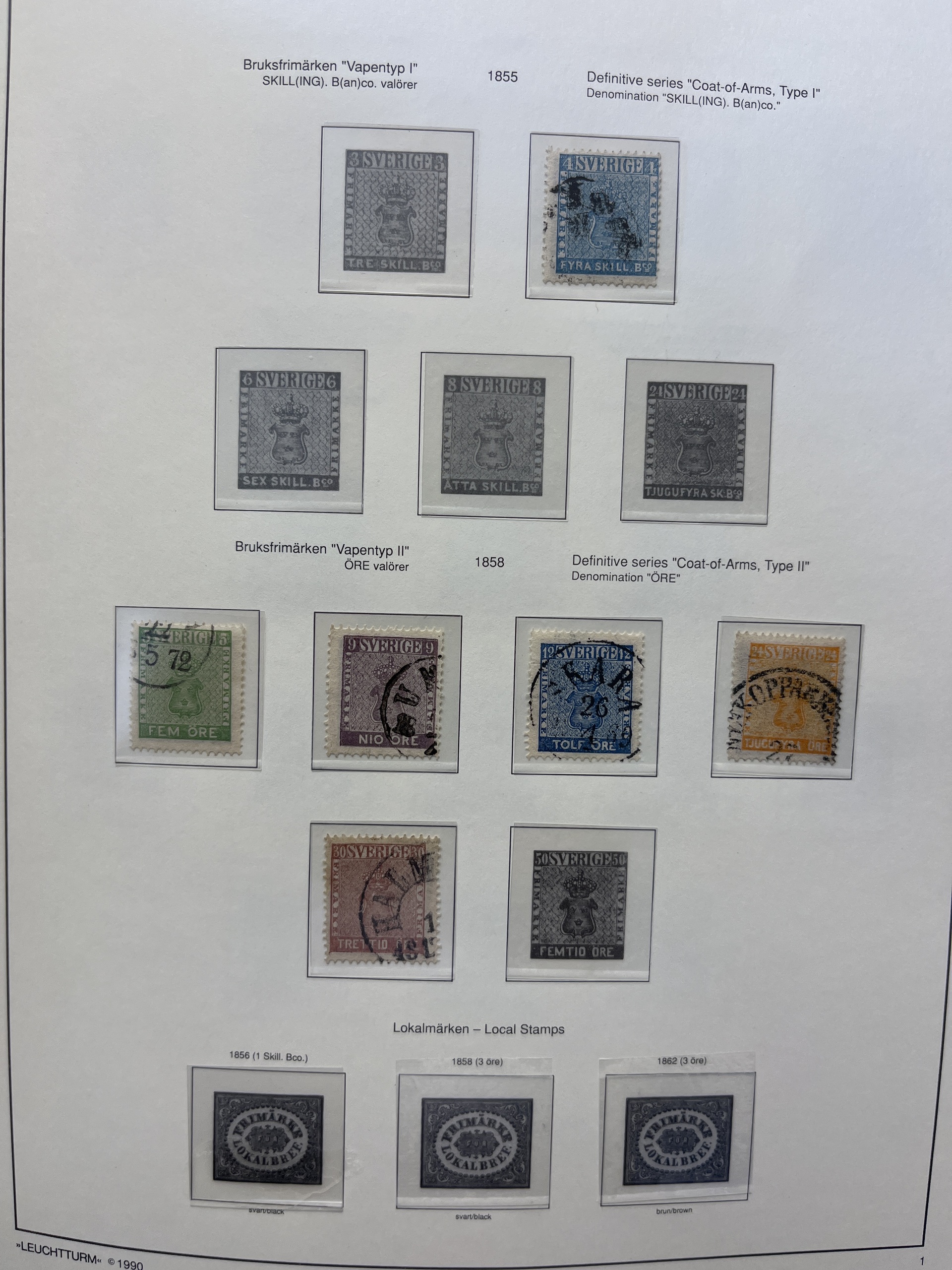 Sweden. Collection used 1855–2013 in three fine Leuchtturm albums with stamp mounts. Few stamps after 2005. Fine quality. Approx. 7 kg.