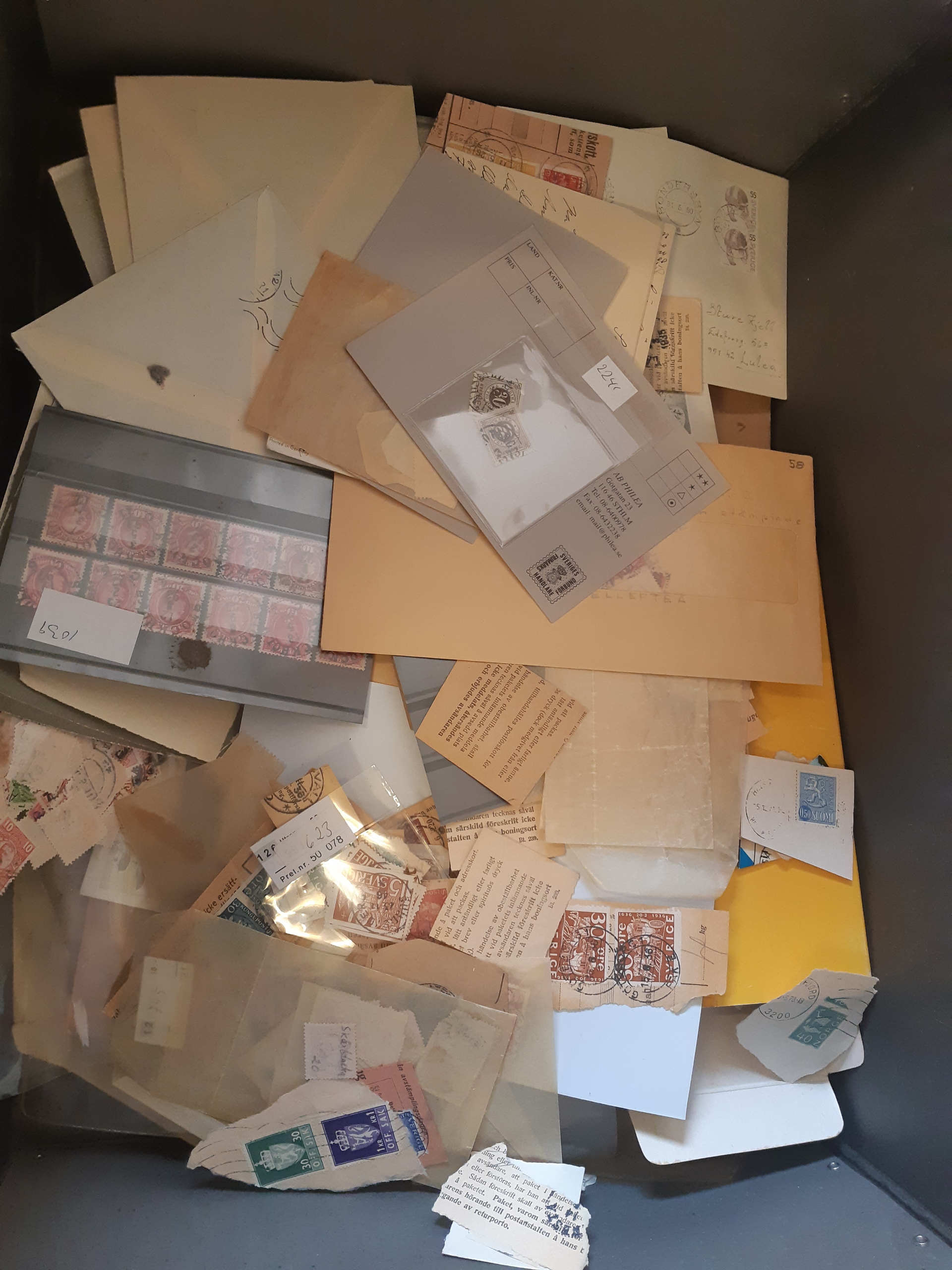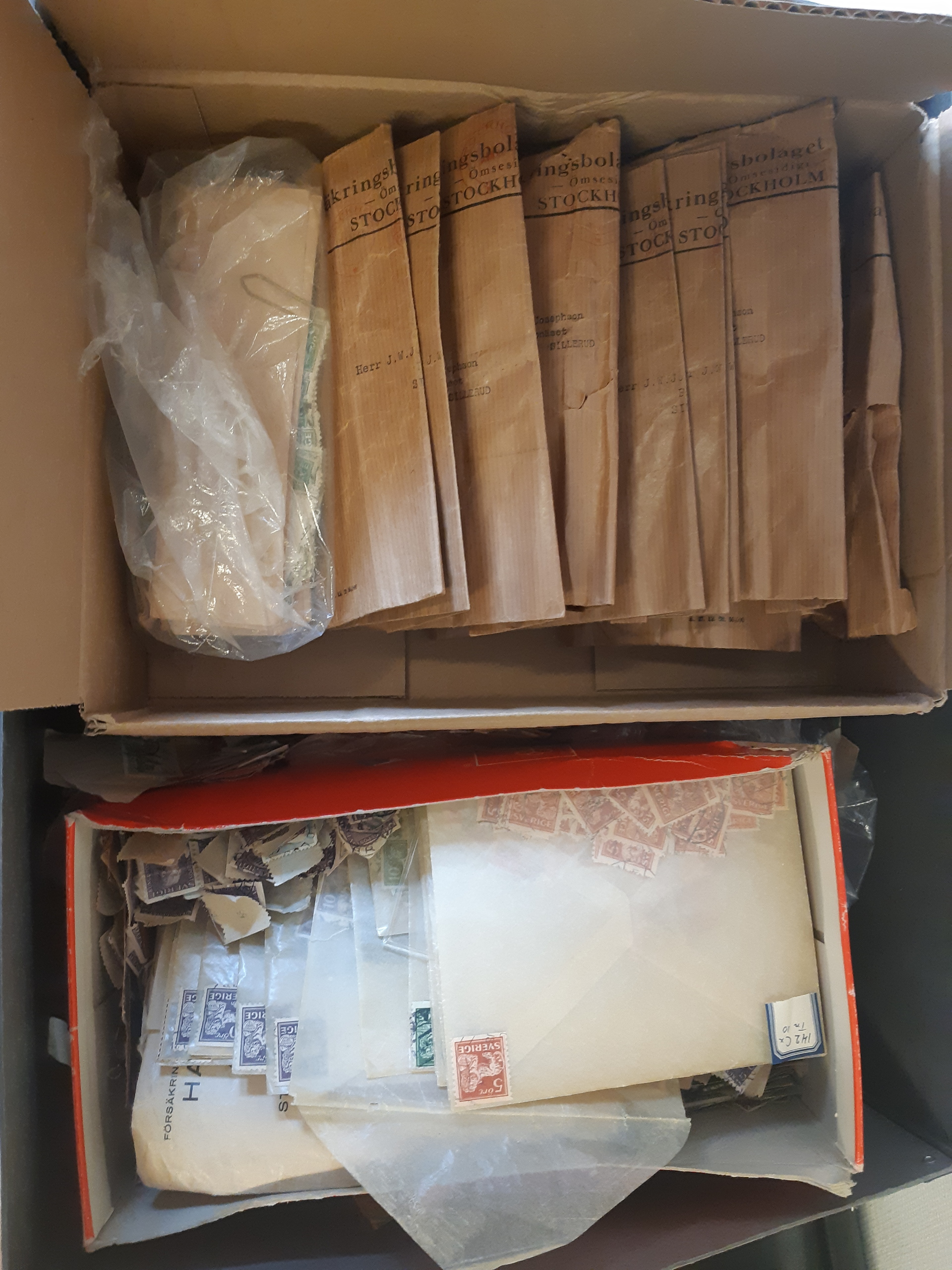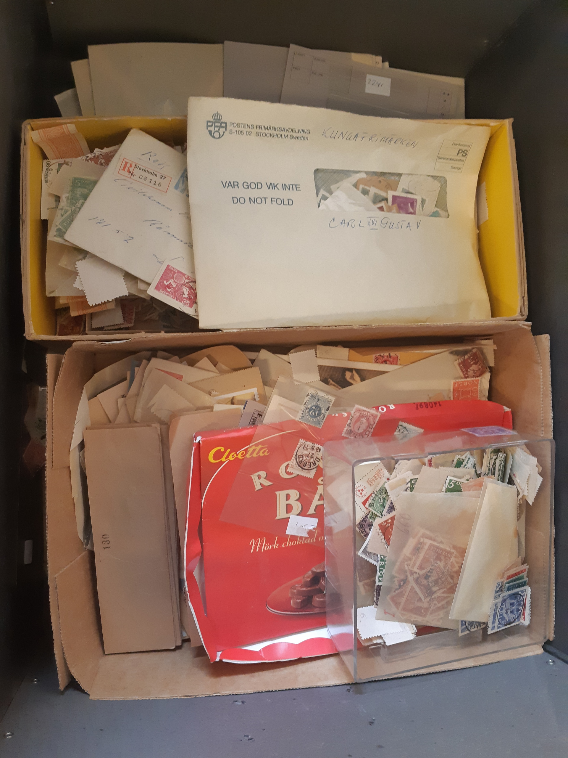 Sweden. Accumulation used in large box. Large duplicate lot 1880s and onwards incl. much coil stamps, and later, off/on paper, partly sorted in envelopes. Seems interesting – much to look through. Approx. 9 kg. (many 1000s)