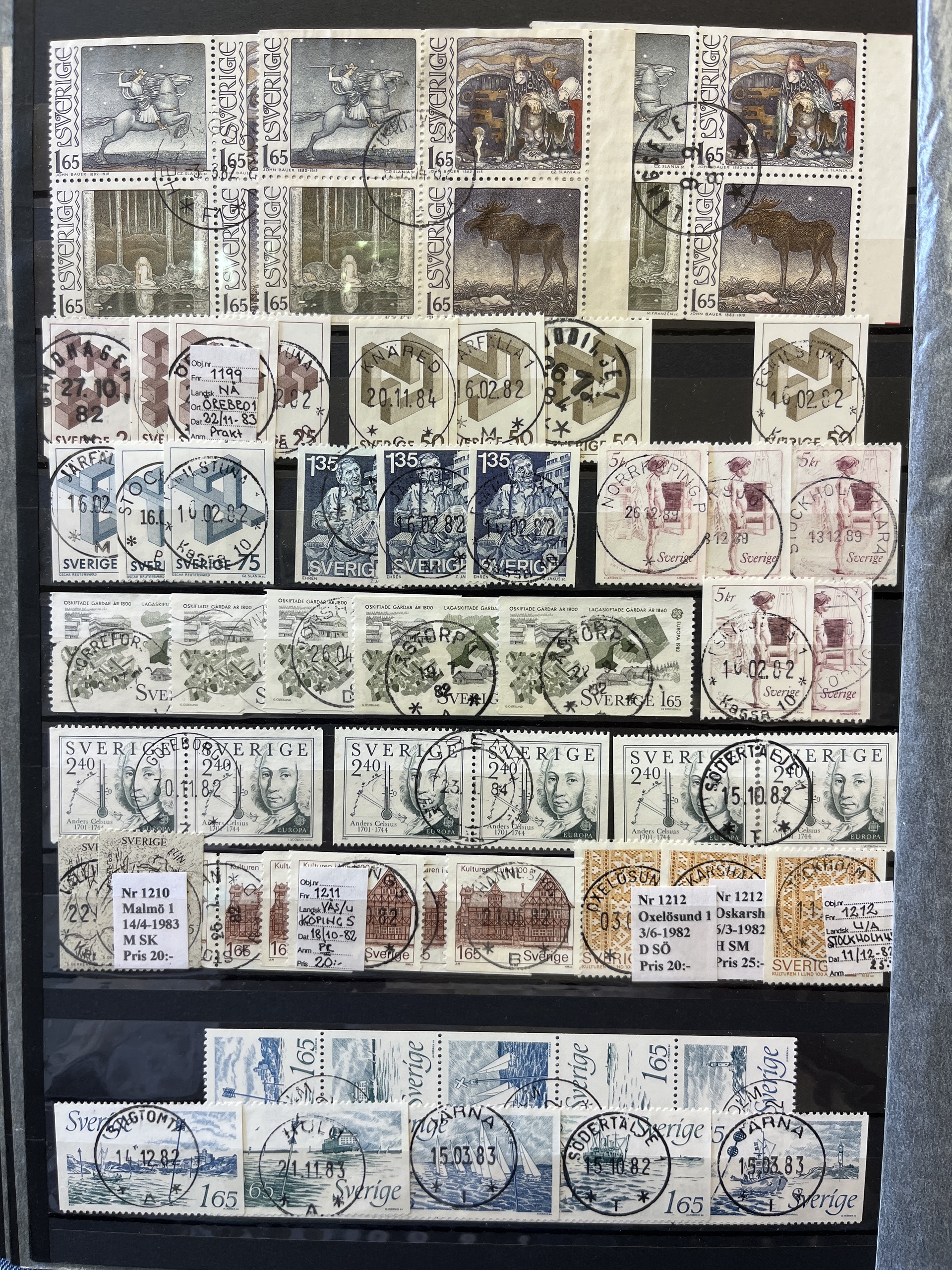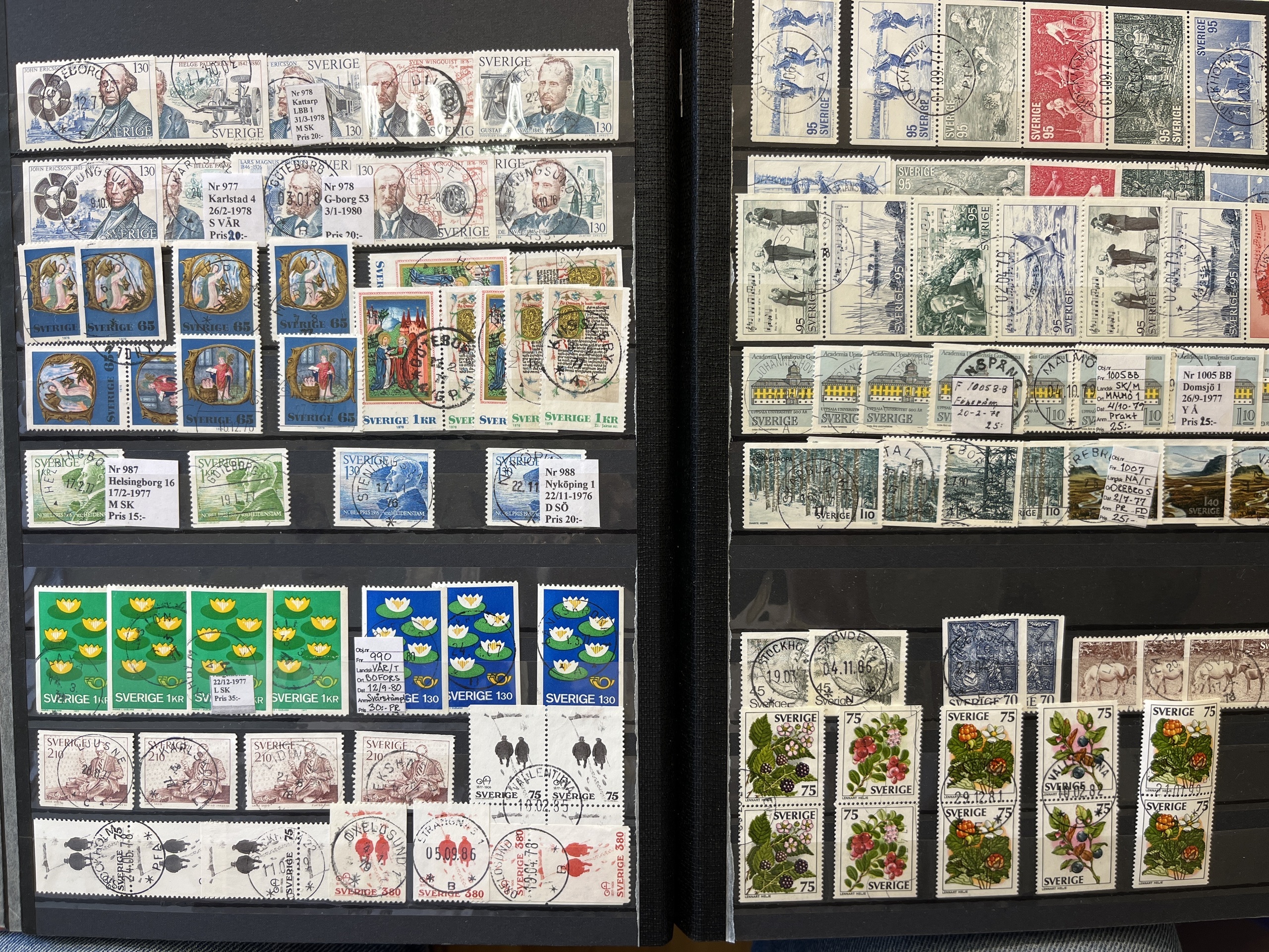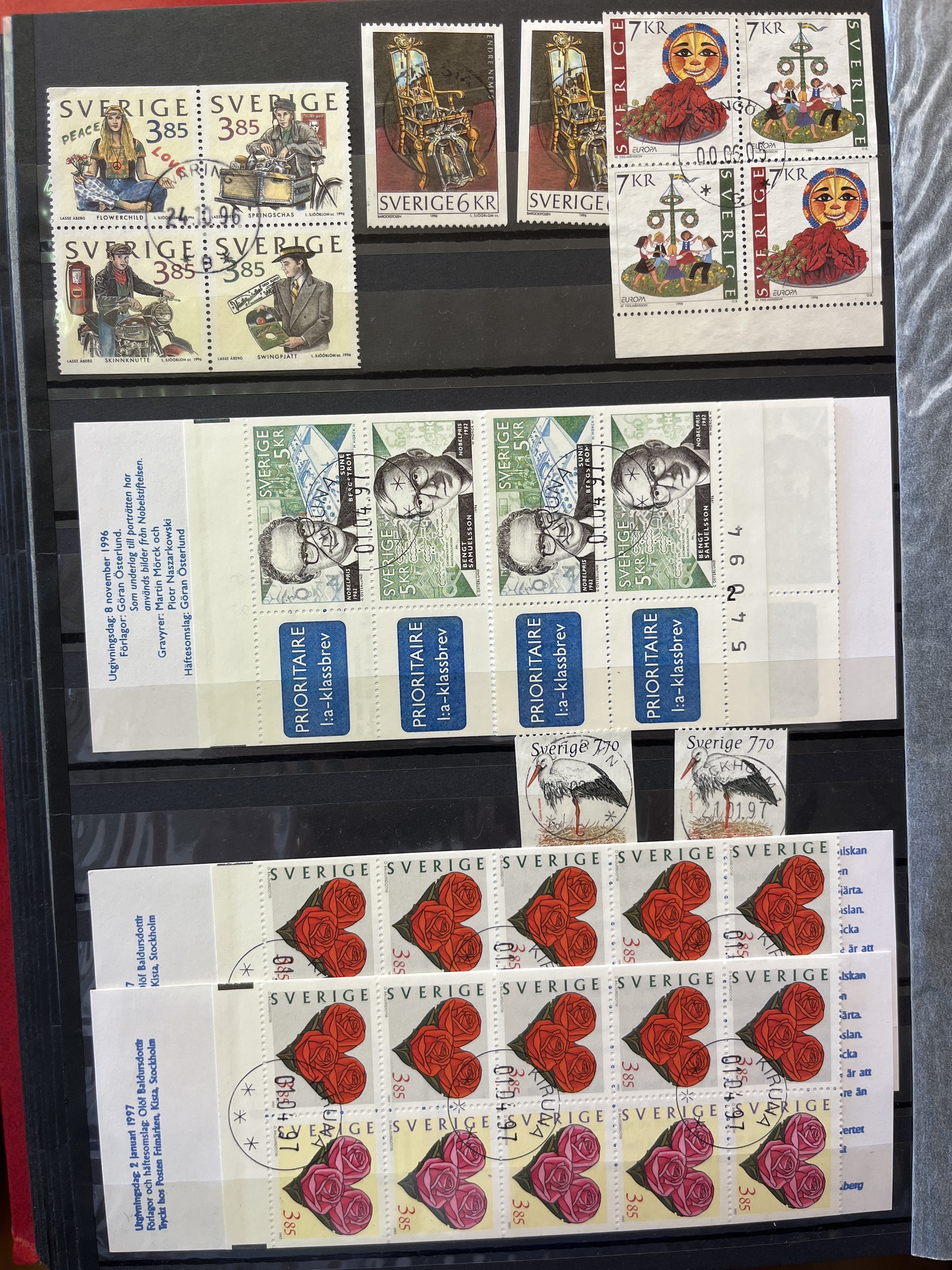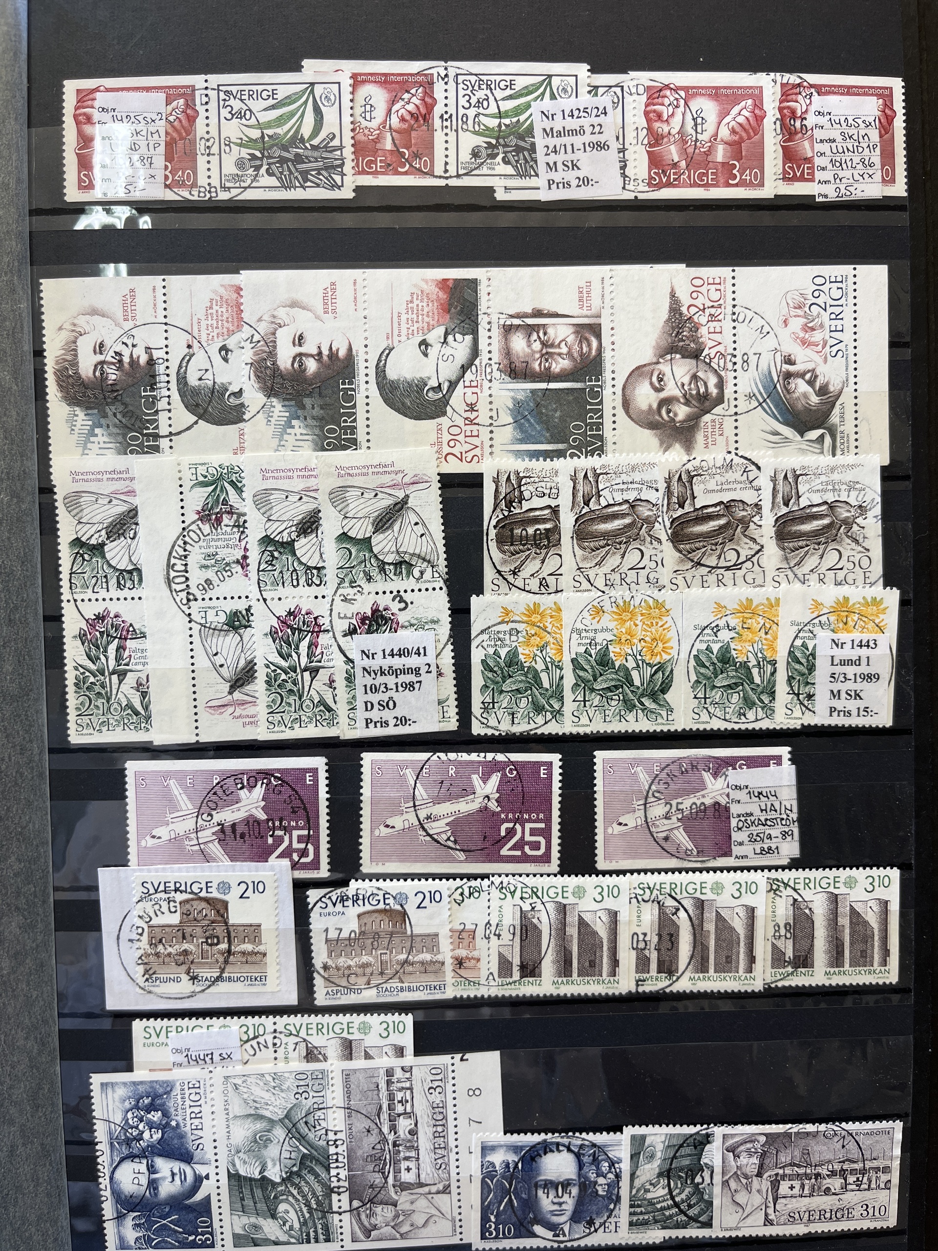 Sweden. Collection/accumulation used 1972–1999 in two full stockbooks. Many EXELLENT canc. on stamps and blocks/booklets.