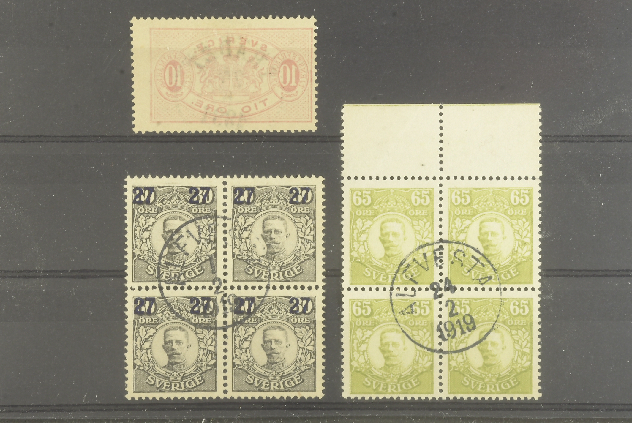 Sweden. Lot used. 65 and 27/80 öre Gustaf V in medallion in block of fours, plus 10 öre Large Ofiicial perf. 13 with set-off. (3)