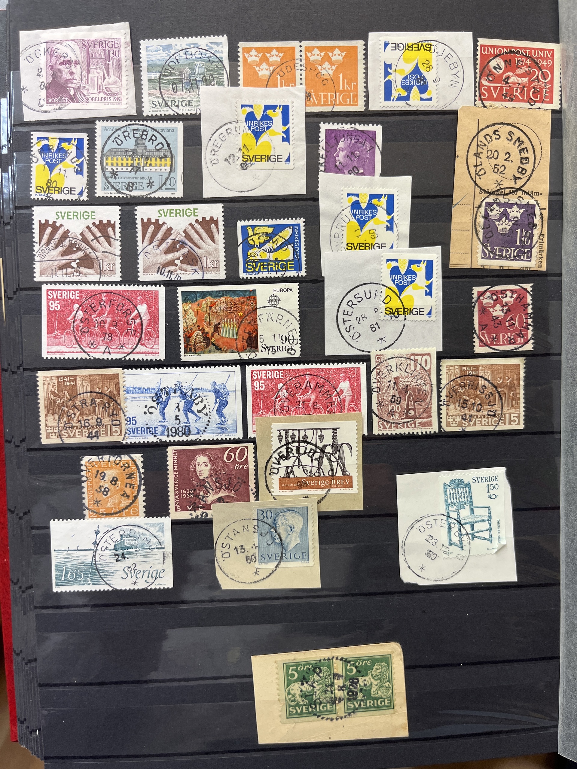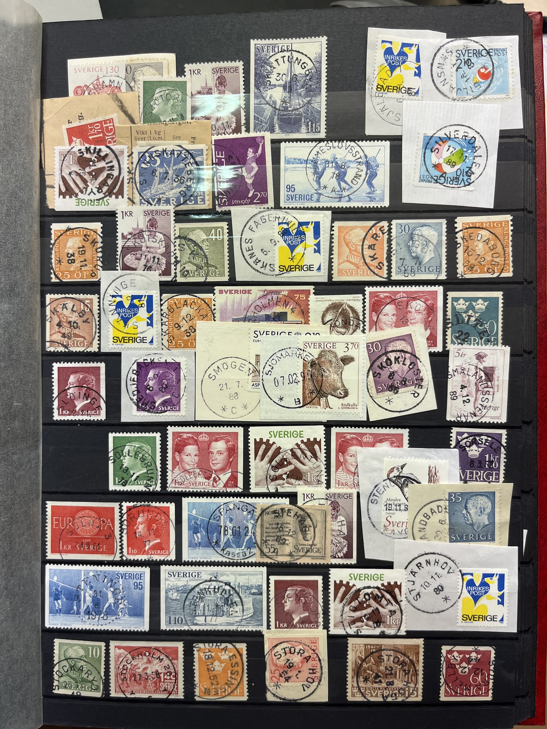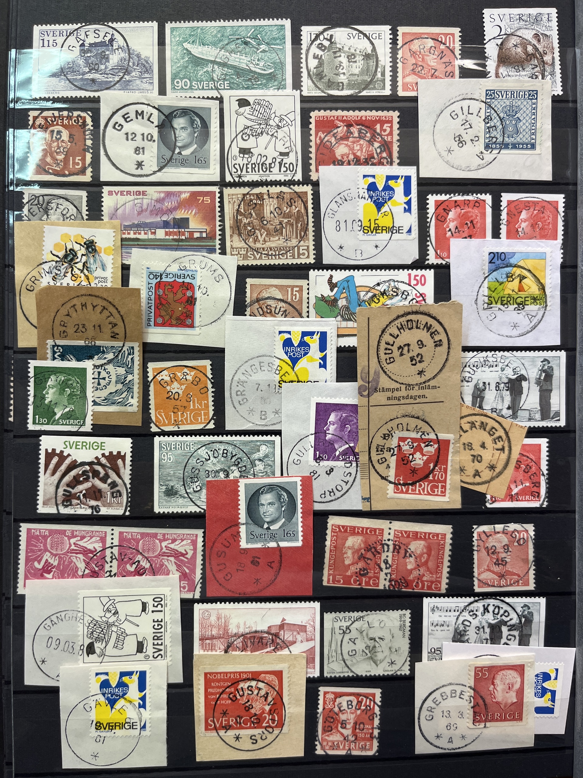 Sweden. Lot used 1900s in three albums. One album with covers, documents and two stockbooks with used stamps – one with many very nice canc. and one with BB-pairs.