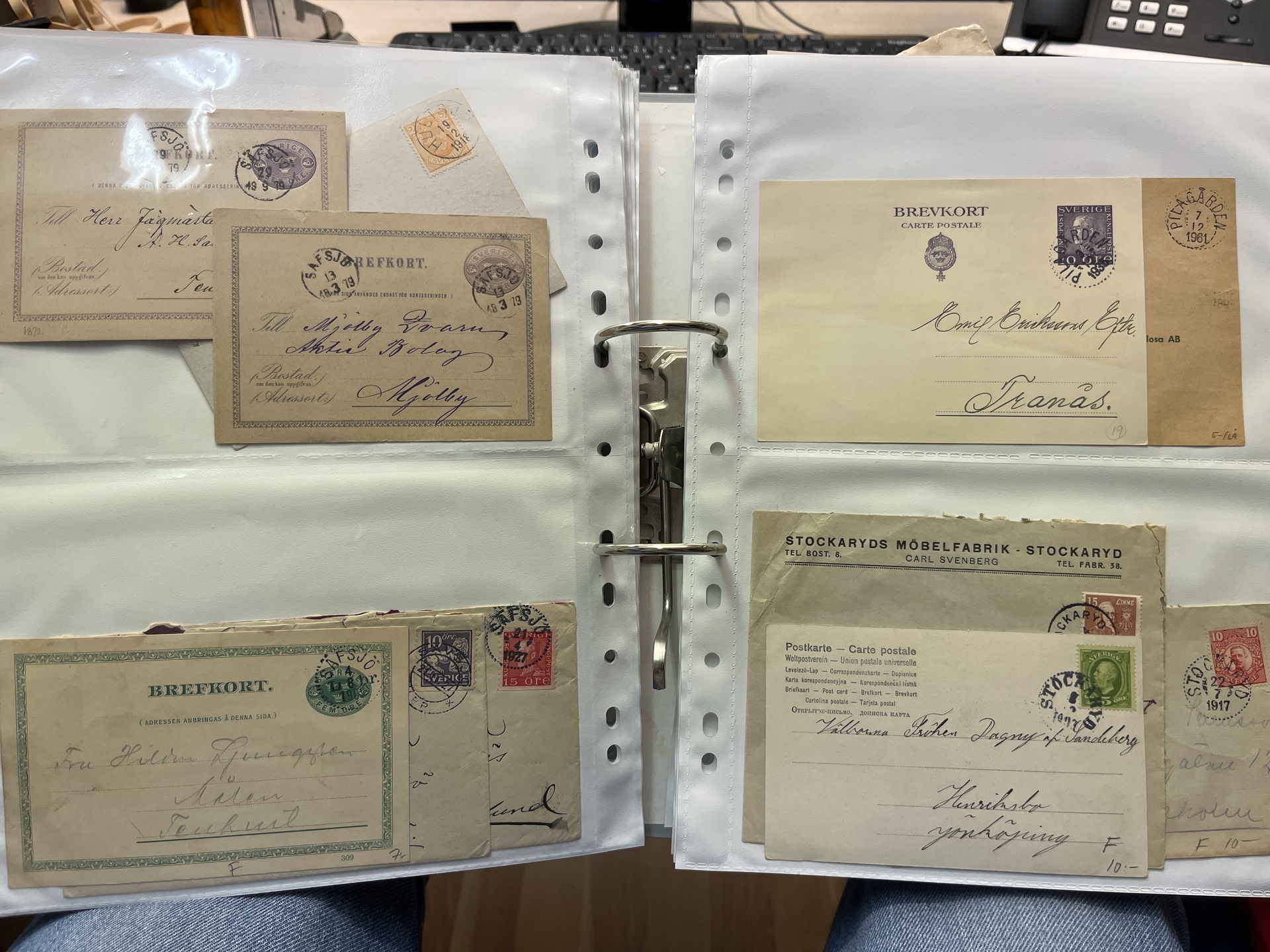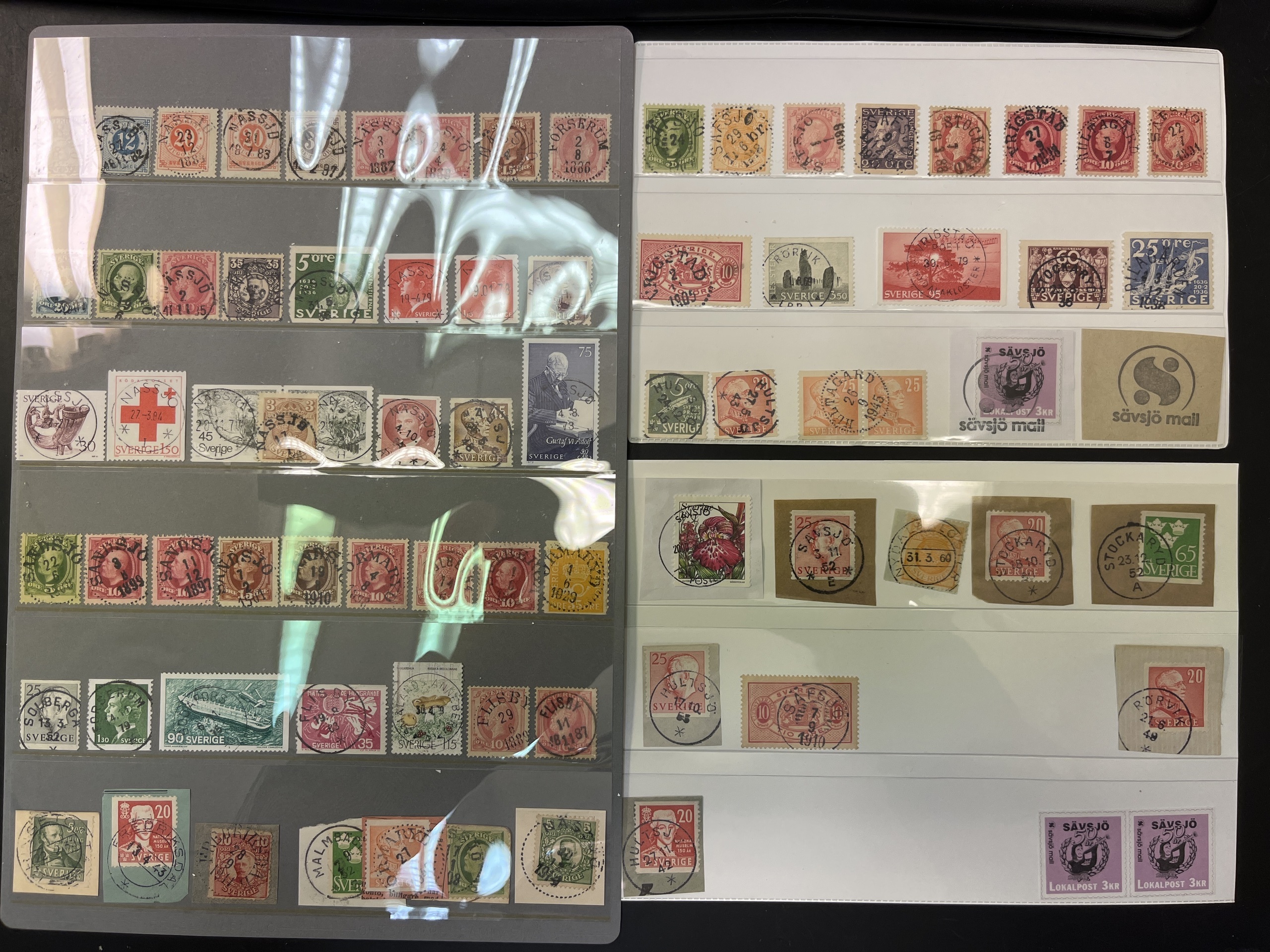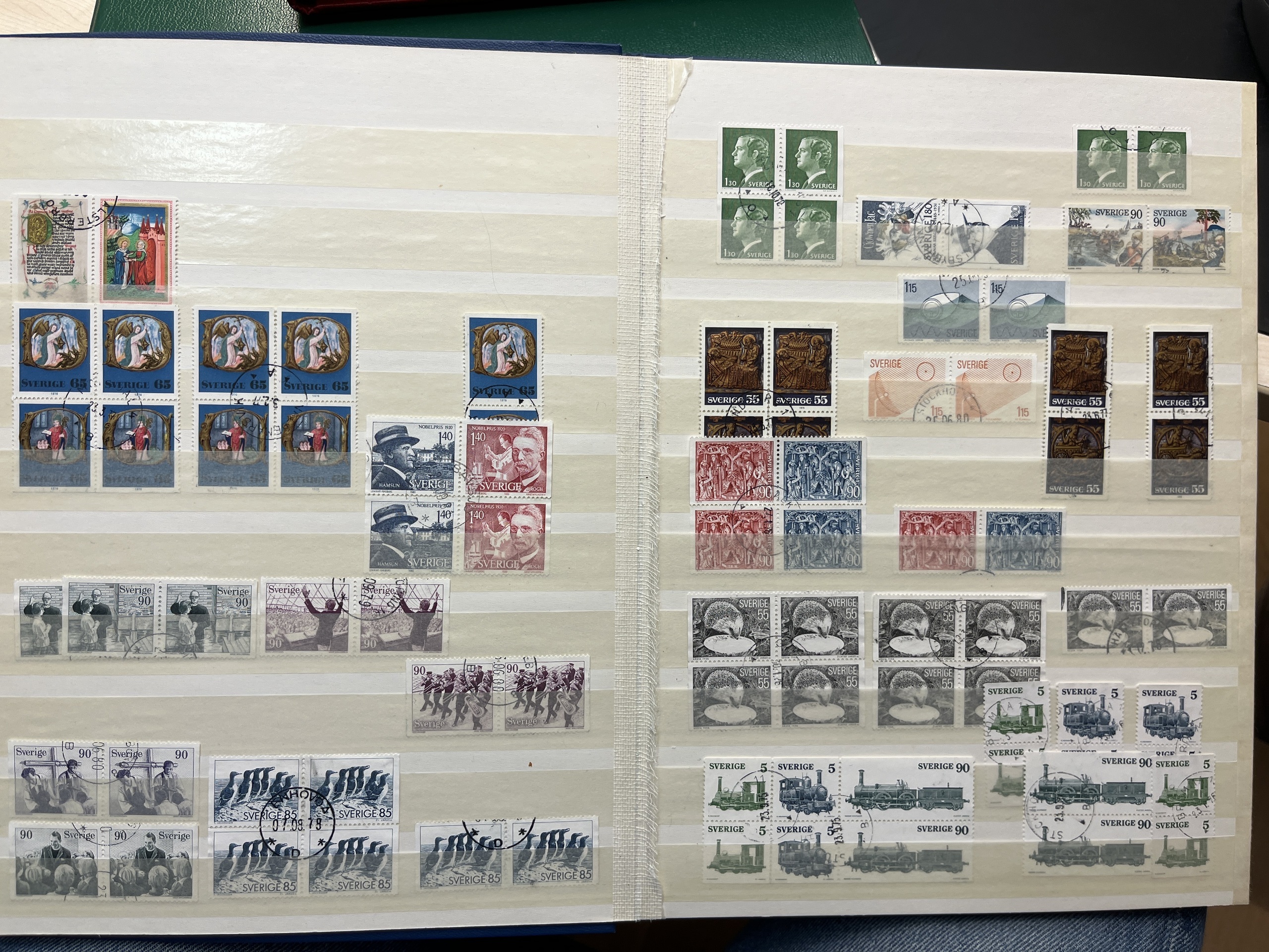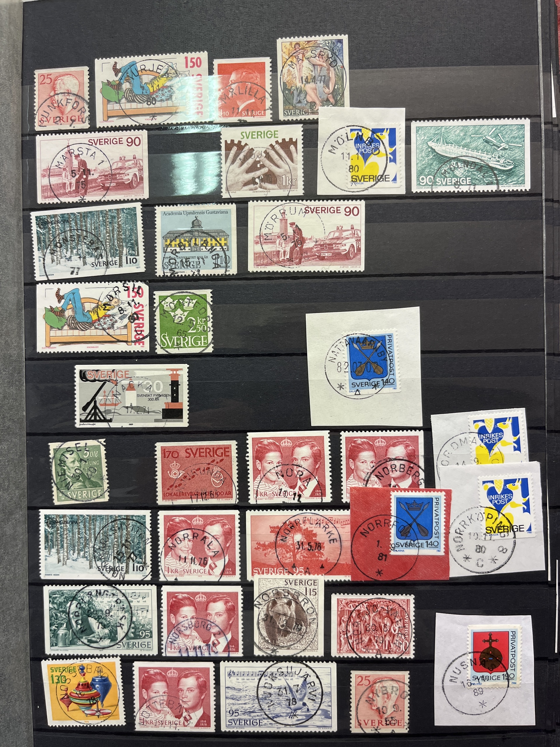 Sweden. Lot used 1900s in three albums. One album with covers, documents and two stockbooks with used stamps – one with many very nice canc. and one with BB-pairs.