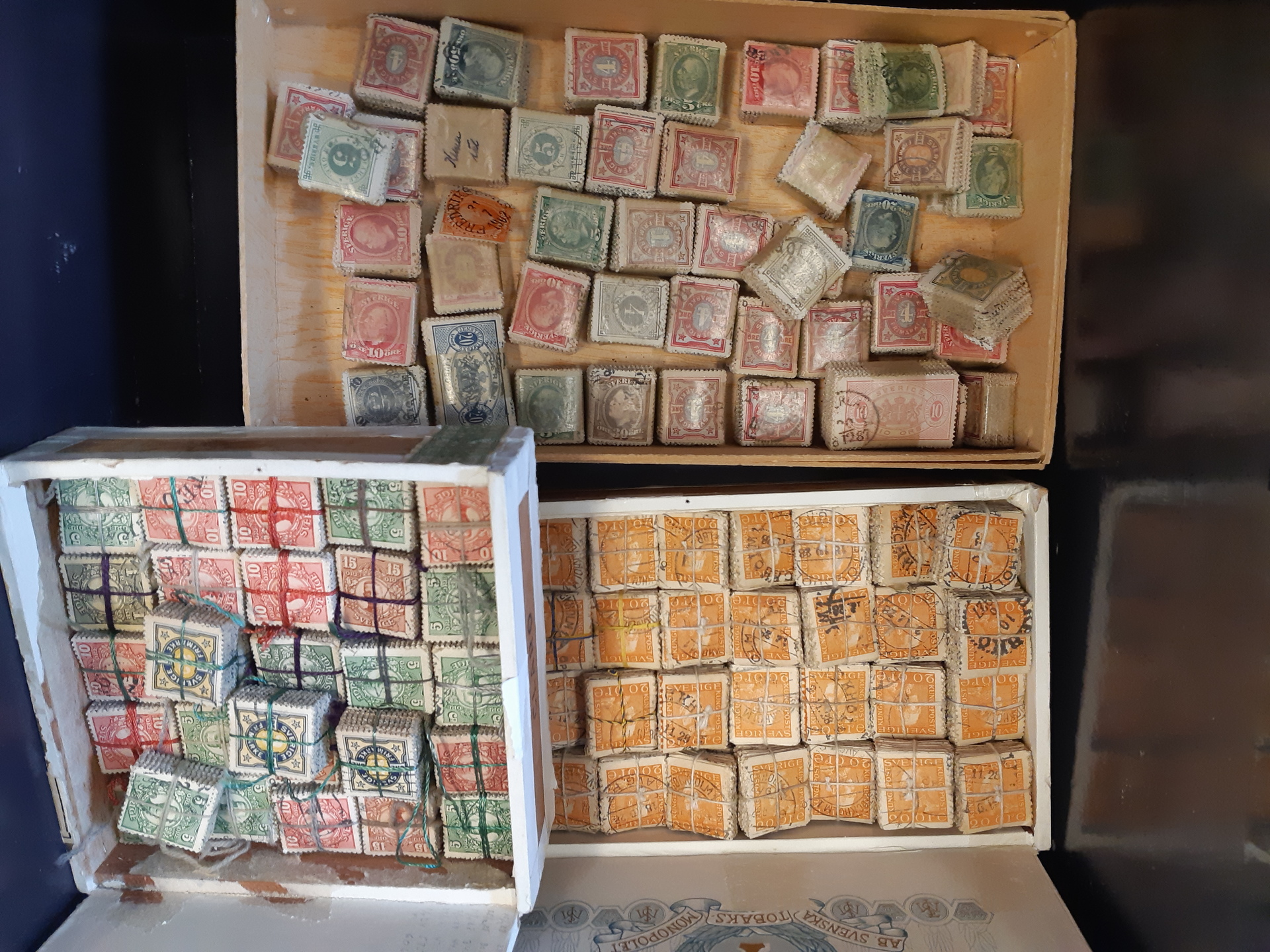Sweden. Bundles, accumulation 1890s–1920 in three cigarr boxes, etc. in box. A few Circle type ph, some Oscar II, about 50 Gustaf V in Medallion and 130 bundles with F181. (227)