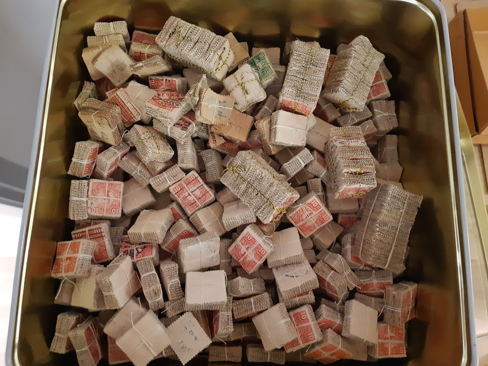 Sweden. Bundles, accumulation GUSTAF V IN MEDALLION in small metal box. Mostly 10 öre without wm or with KPV (F82), but likely also some with vm crown (F76). Also a few other denominations and a few bundles of 25–50 stamps (not counted). (309)