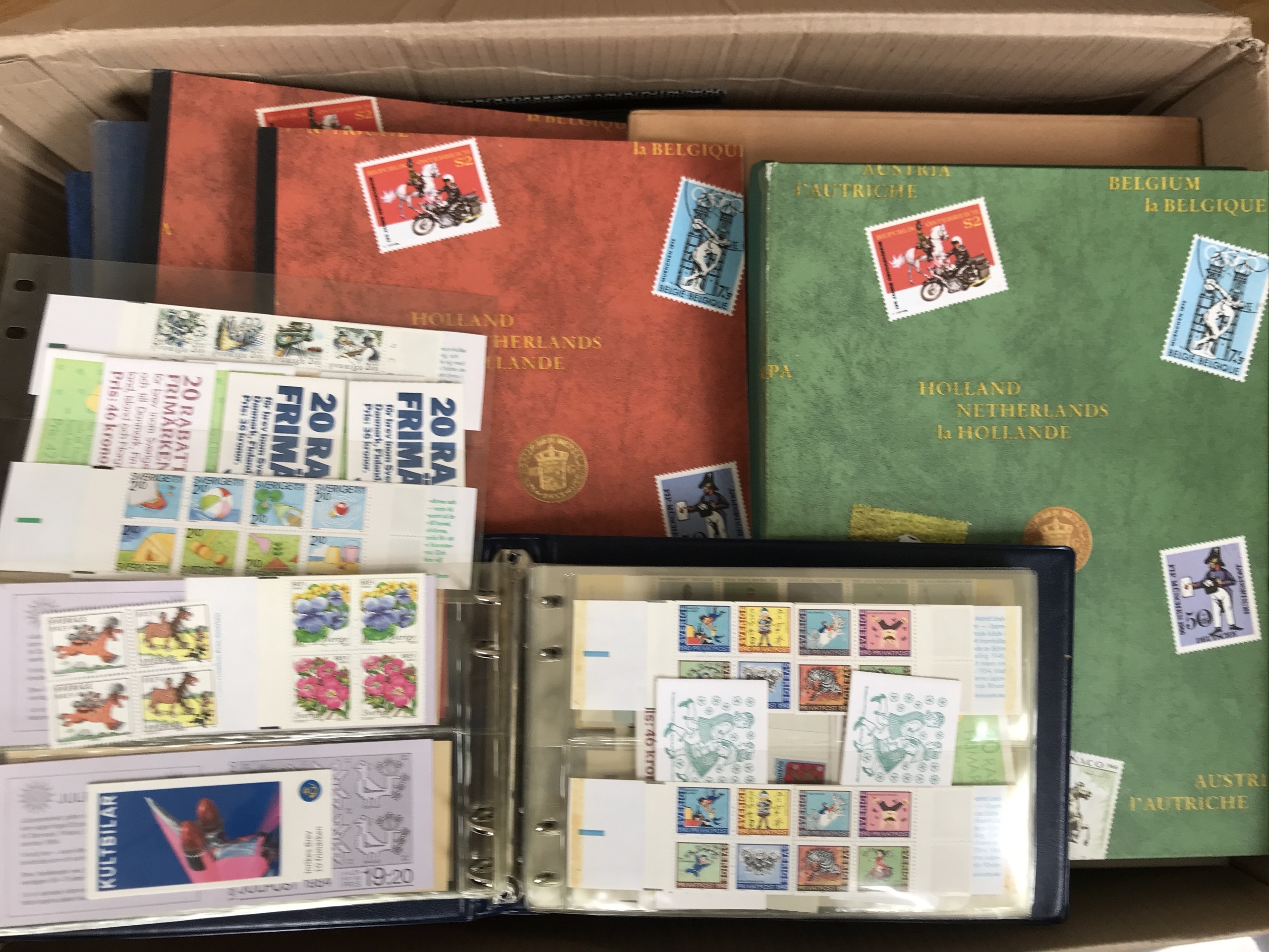 Sweden. ★★/★/⊙. Removal box with 1000s of stamps old–modern in albums and envelopes etc. E.g. modern ** incl. 12 discount booklets + 58 stamps. 18 'Sverige BREV', etc. Also several other countries incl. some Cinderella, etc. Approx. 22 kg.