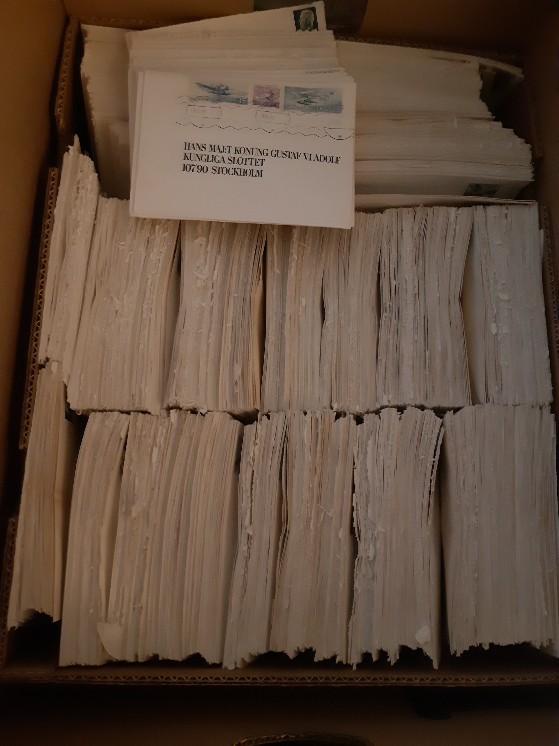 Sweden. Accumulation ★★/⊙ in removal box. Slot-machine booklets with total face value >2100 acc. to vendor, plus large acc. with several 100s of covers sent to Gustaf VI Adolf in 1971. Approx. 23 kg.