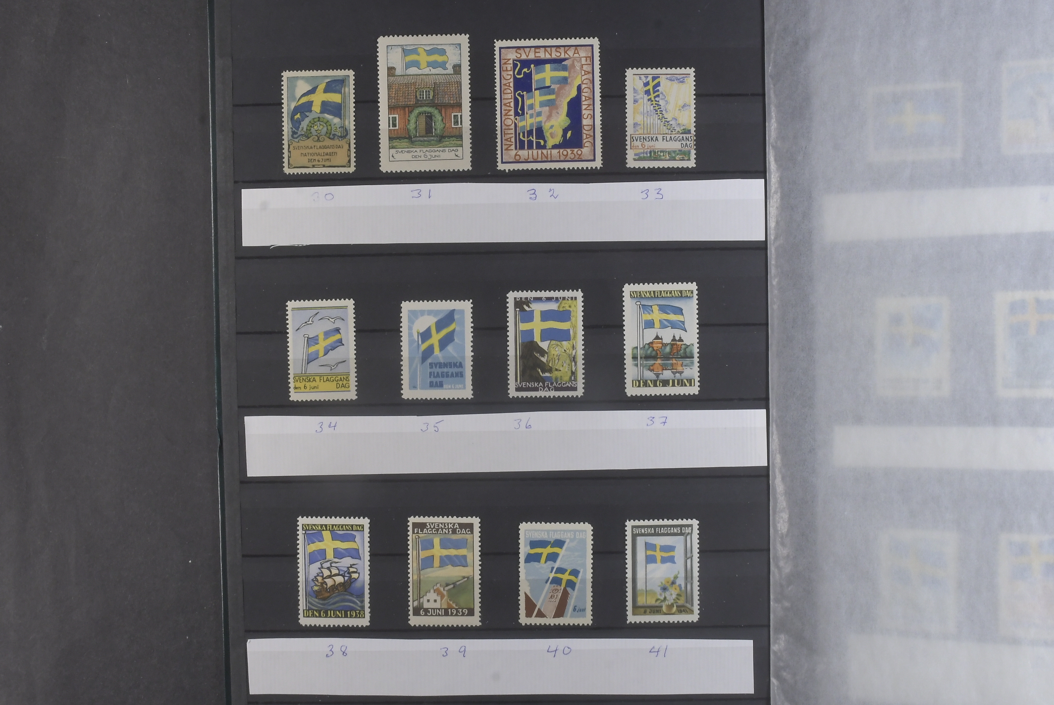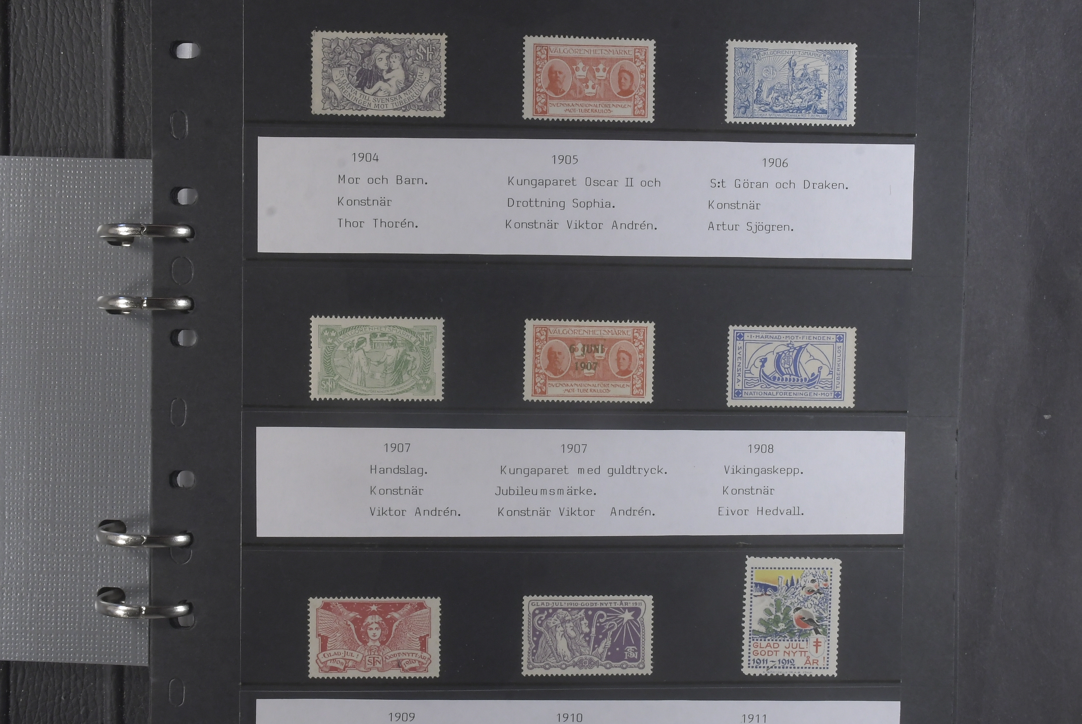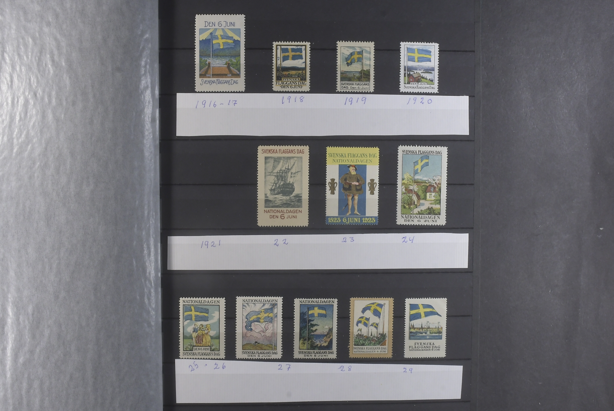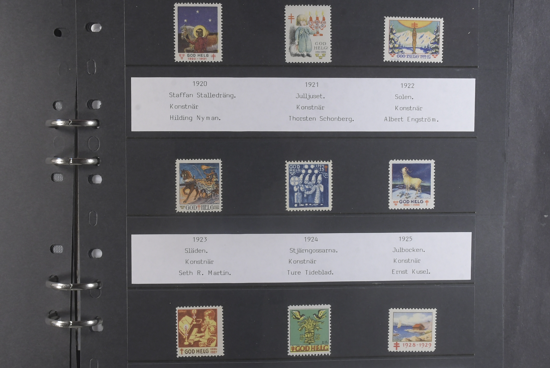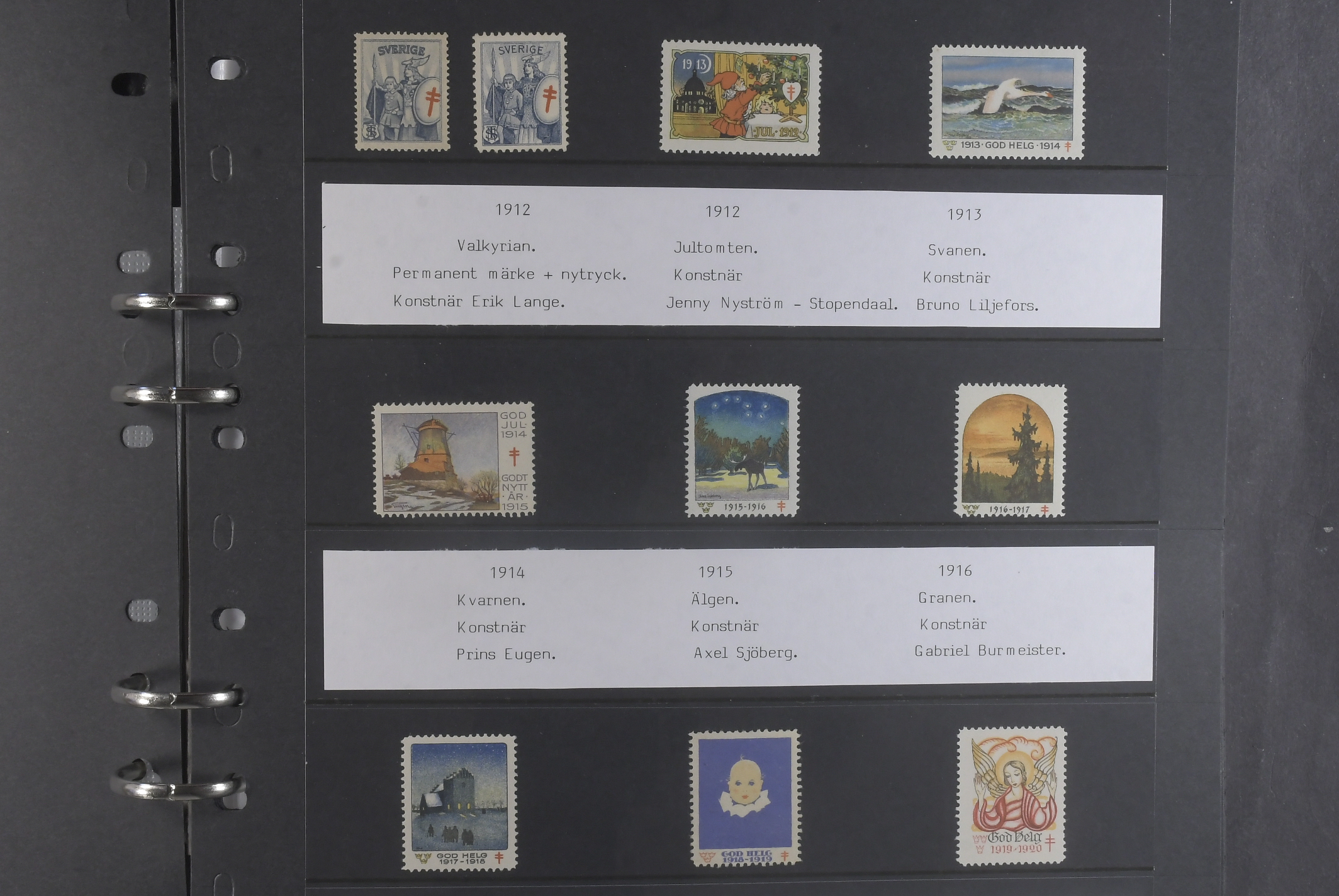 Sweden. Seals, collection 1904–2001 in stockbook and album. SvNf Christmas seals cpl 1904-2000, (1962 onwards in full sheets). SVENSKA FLAGGANS DAG cpl 1916-2001. Virually MNH and in Very Fine condition. Some scans are presented at www.philea.se.