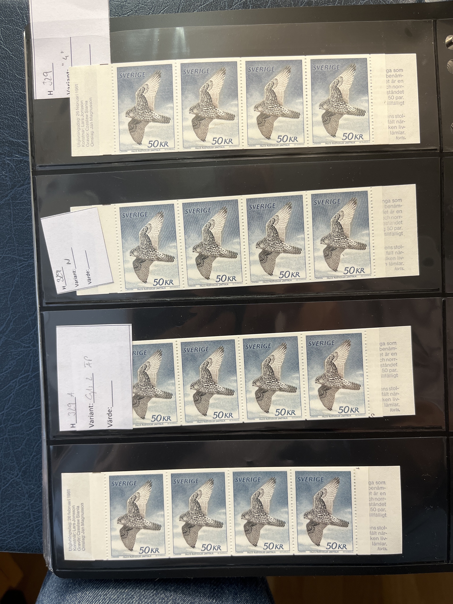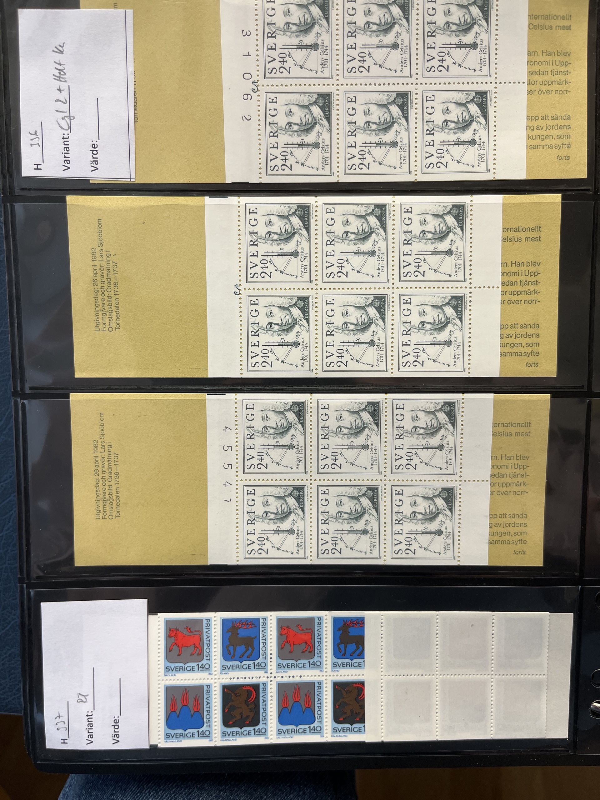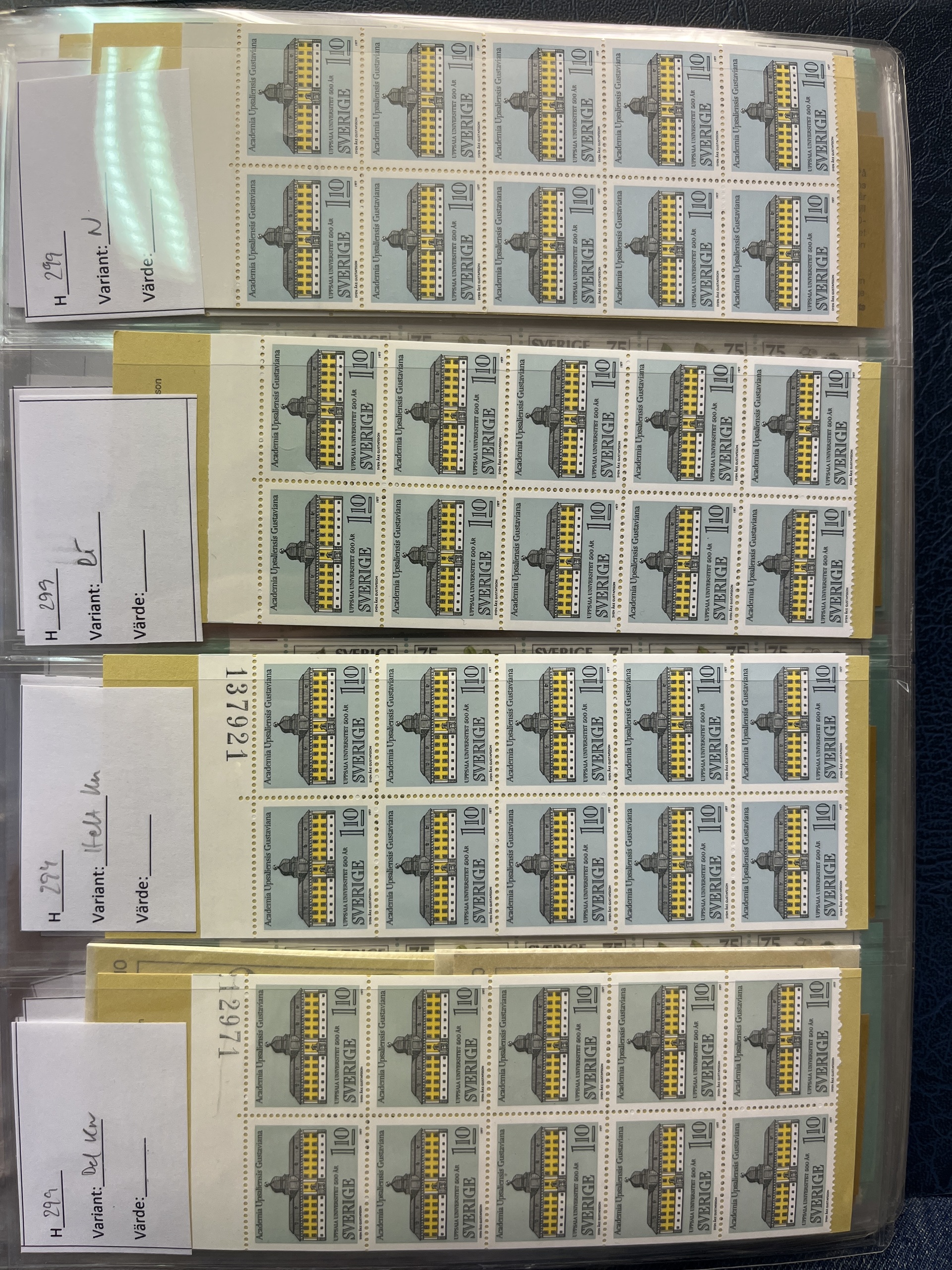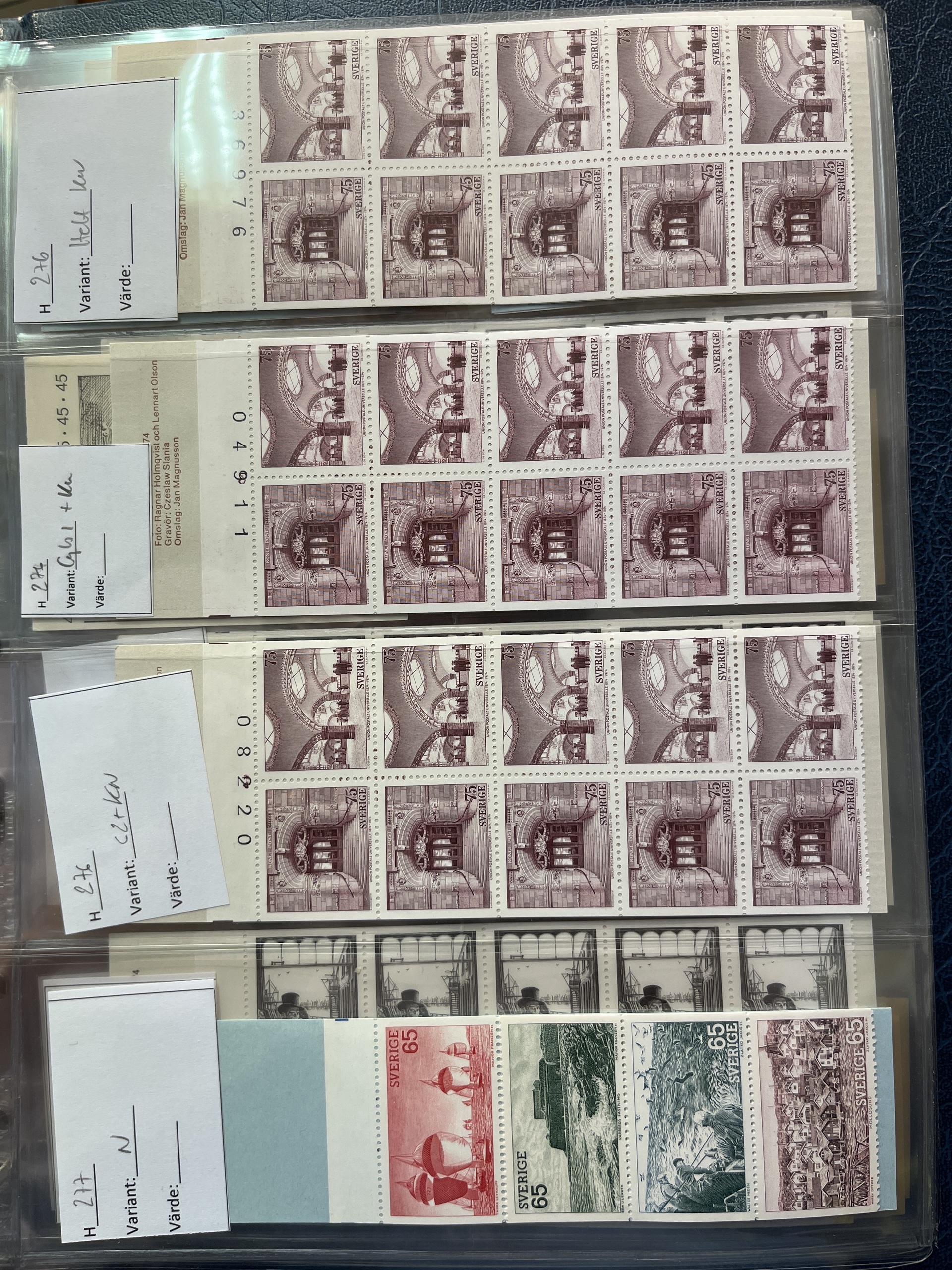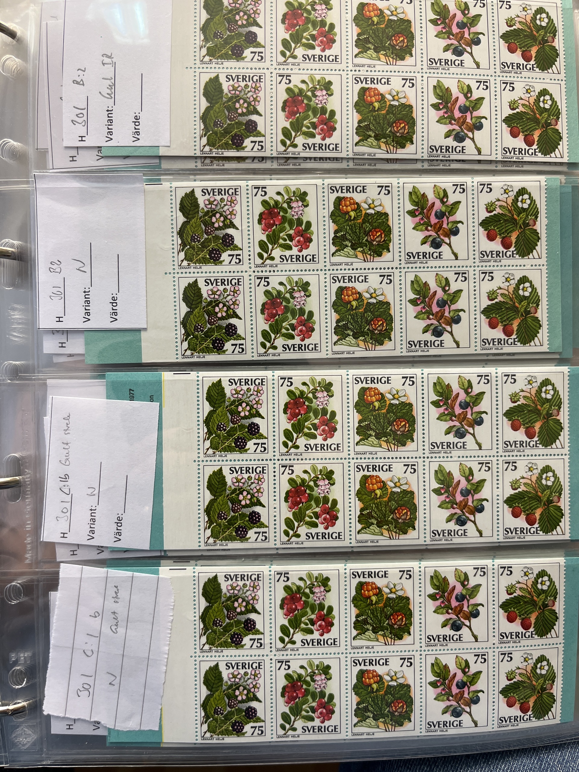 Sweden. Booklets, collection/accumulation 1971–1982 in five Leuchtturm albums with cassette with e.g. nine booklets of 50 kr Falken, Many with cylinder digit, kn and RT. Please see a selection of scans at www.philea.se. Excellent quality. Approx. 15 kg.