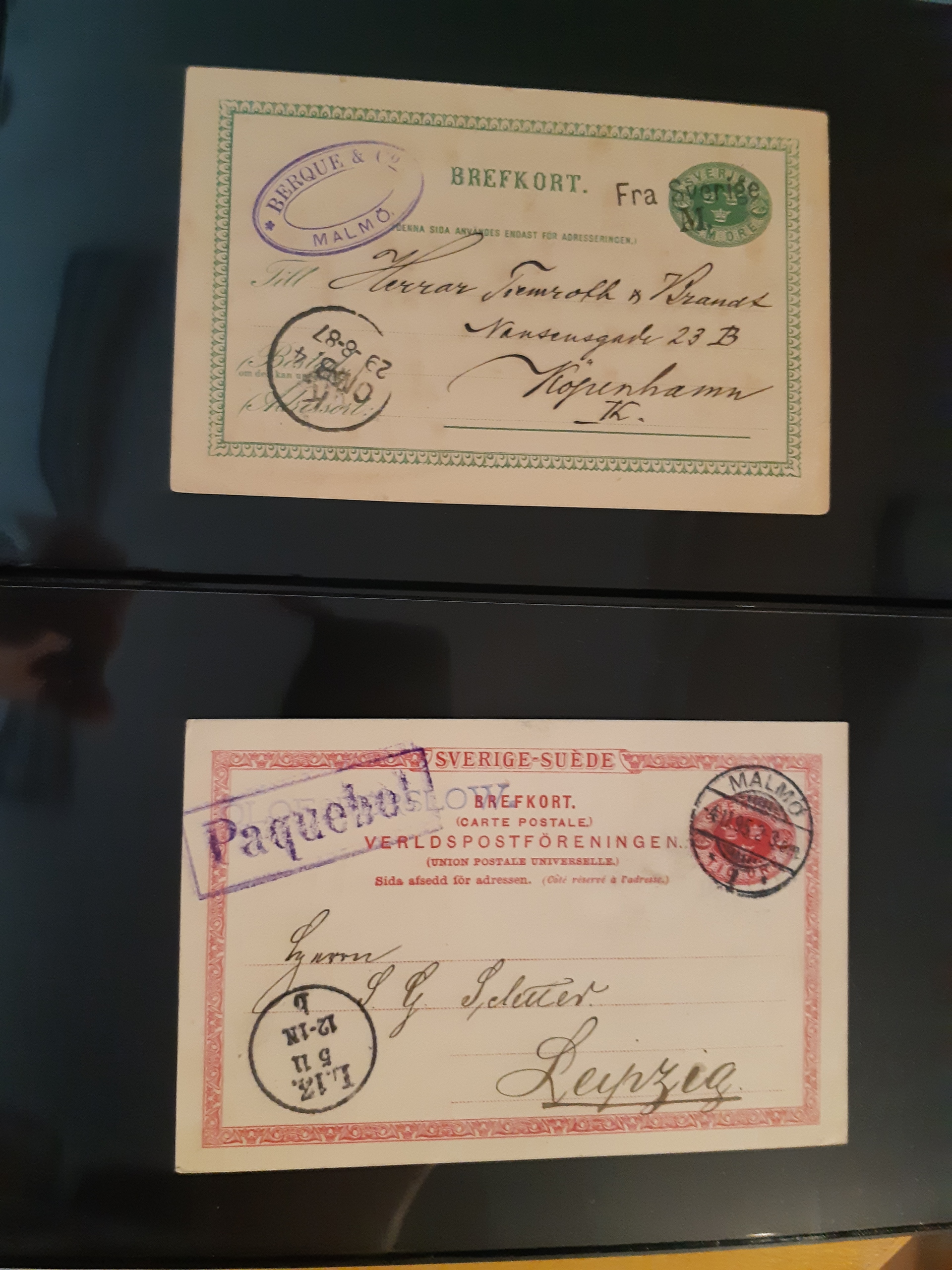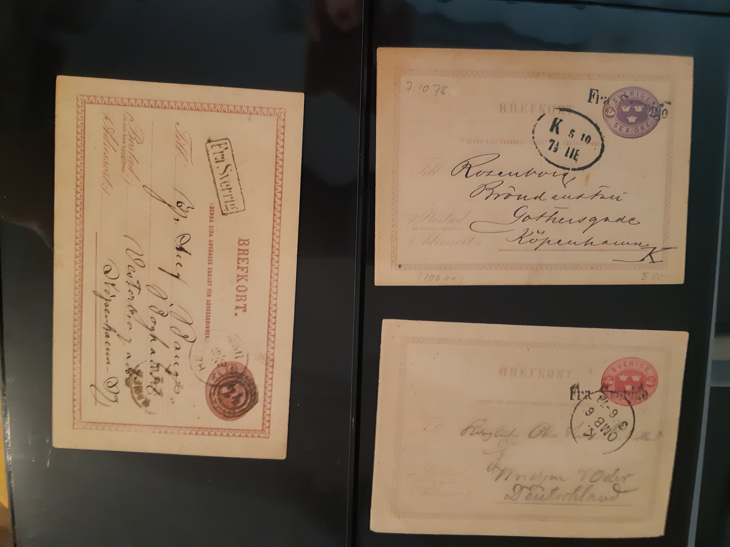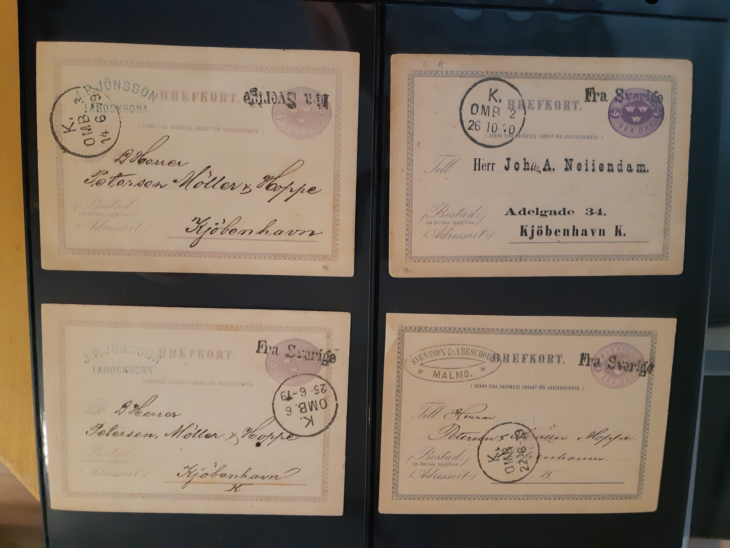Sweden. Cancellations, collection/accumulation FOREIGN POSTMARKS in album. Danish pmks on postcards sent to mostly Denmark and Germany. Incl. e.g. early FRA SVERRIG, numeral cancellations, PAQUEBOT, etc. Somewhat mixed quality. (75)
