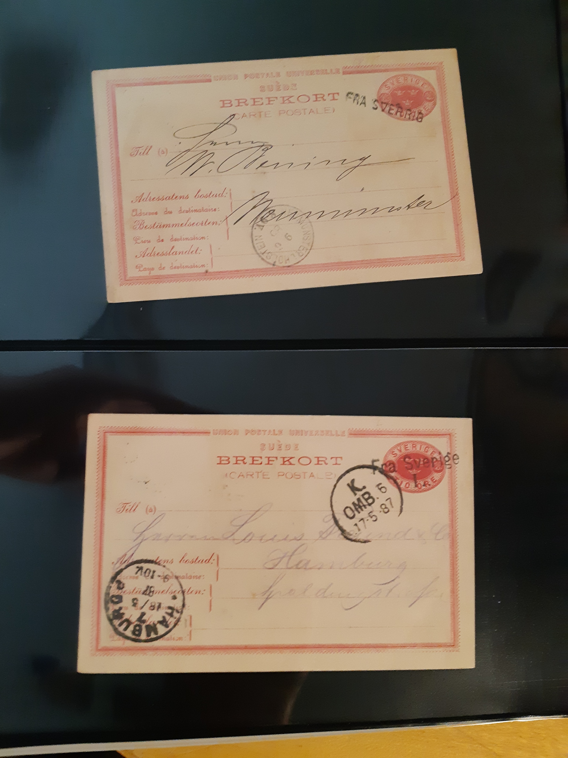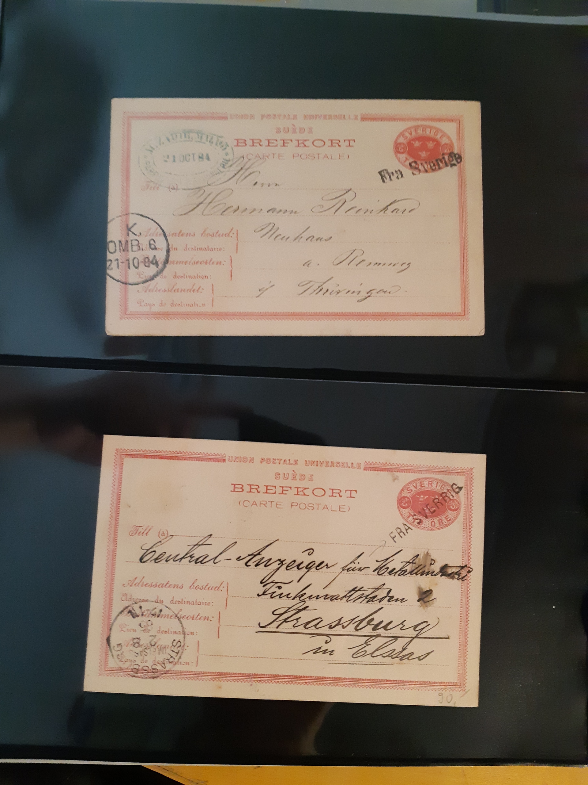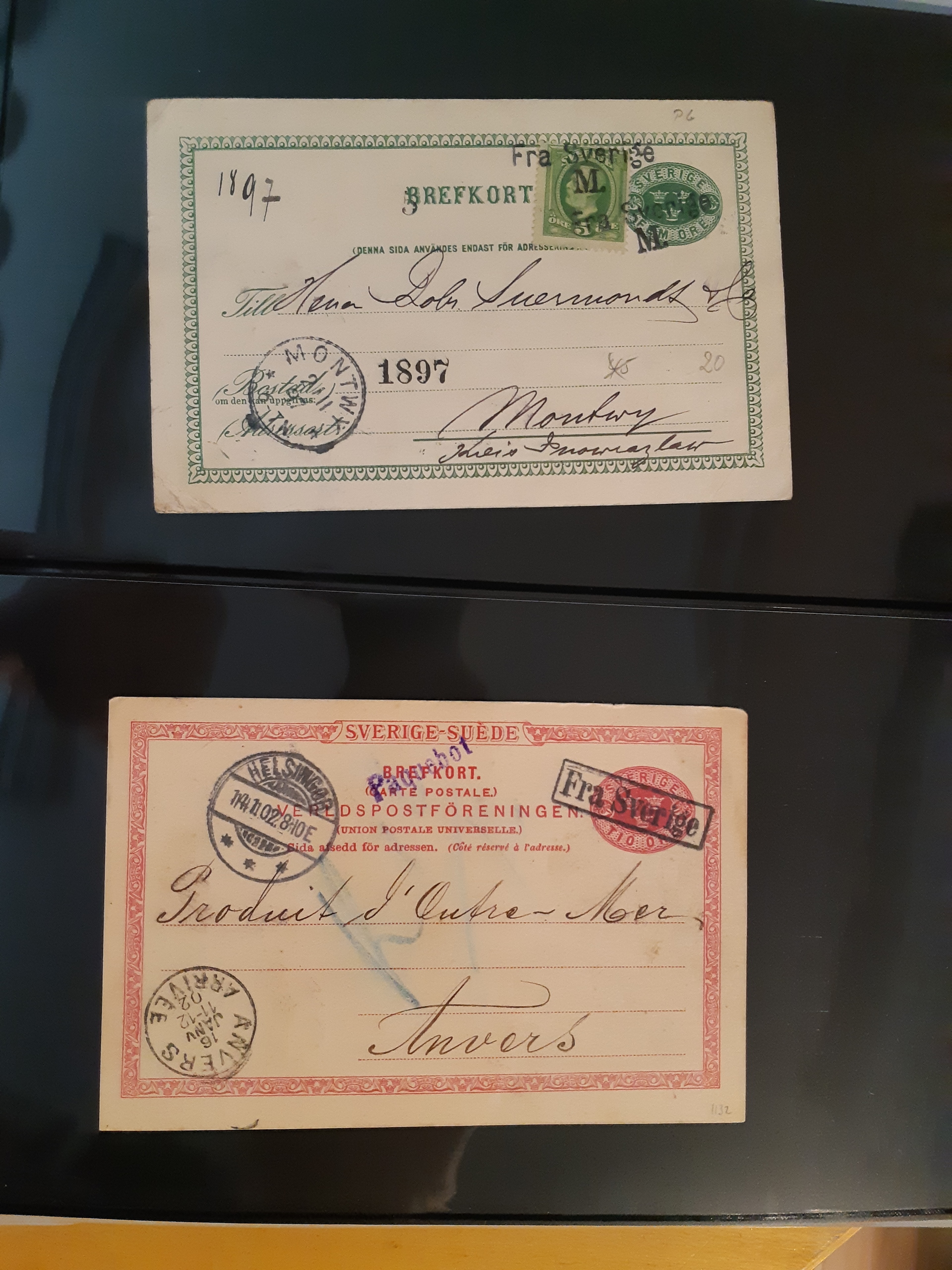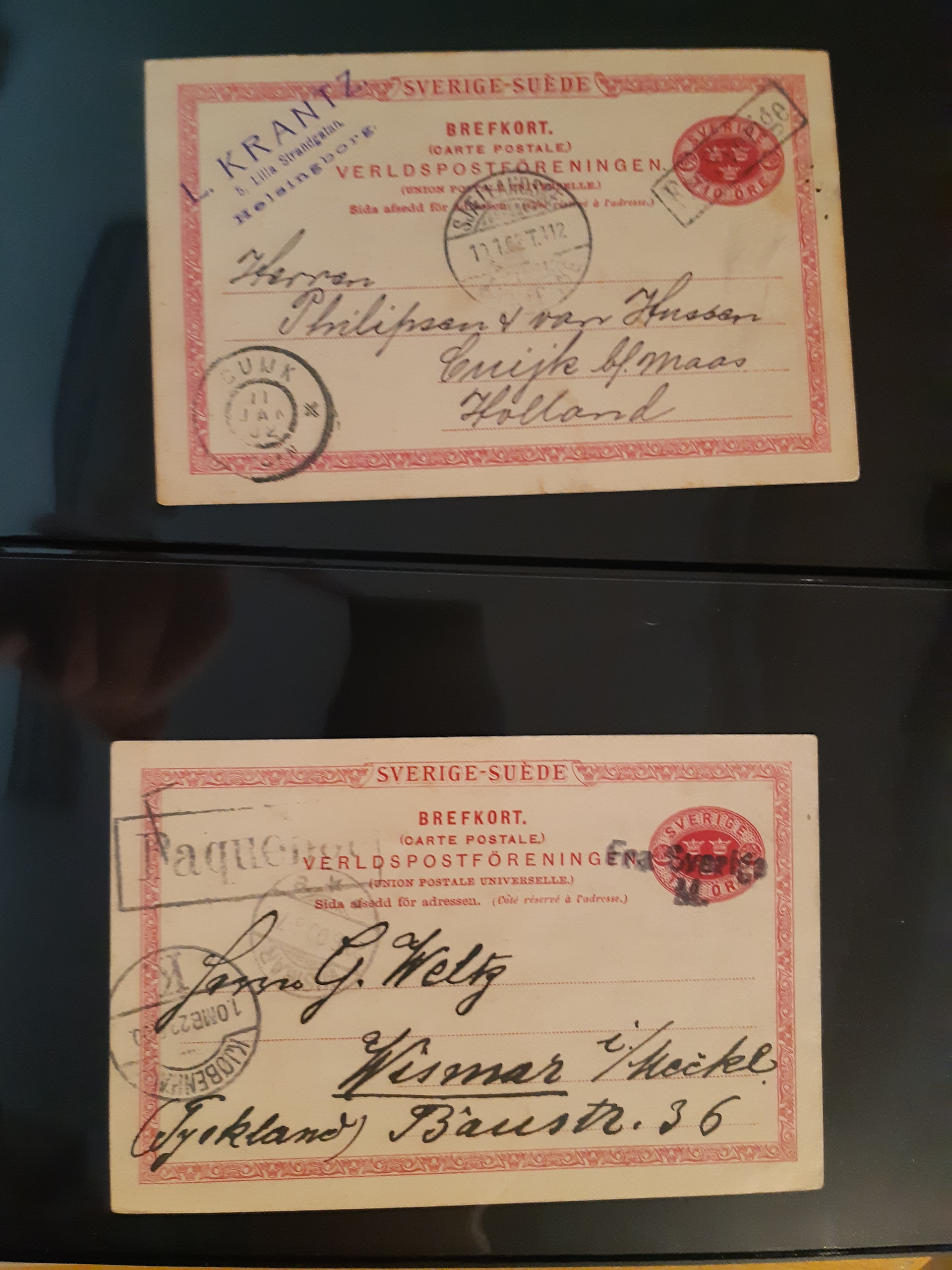 Sweden. Cancellations, collection/accumulation FOREIGN POSTMARKS in album. Danish pmks on postcards sent to mostly Denmark and Germany. Incl. e.g. early FRA SVERRIG, numeral cancellations, PAQUEBOT, etc. Somewhat mixed quality. (75)